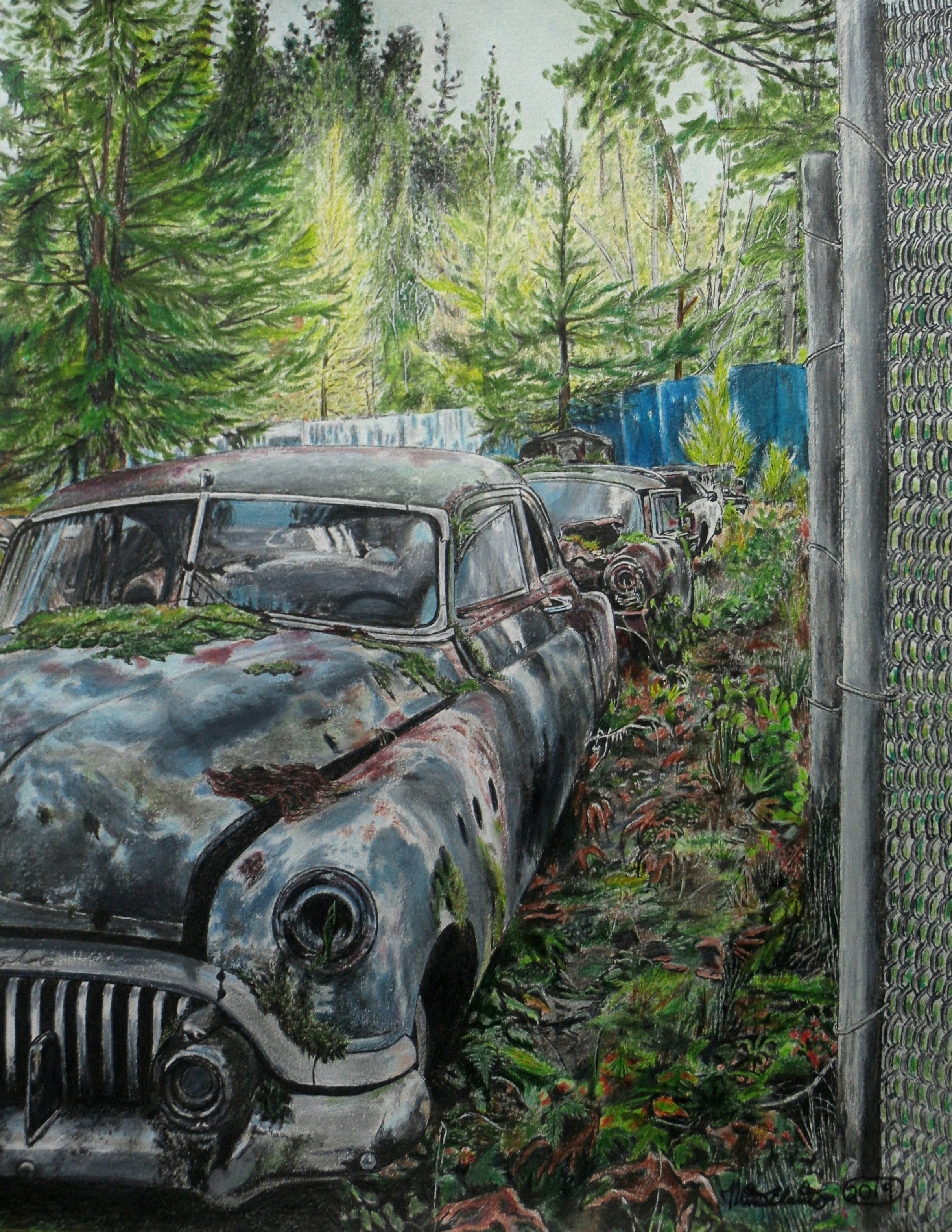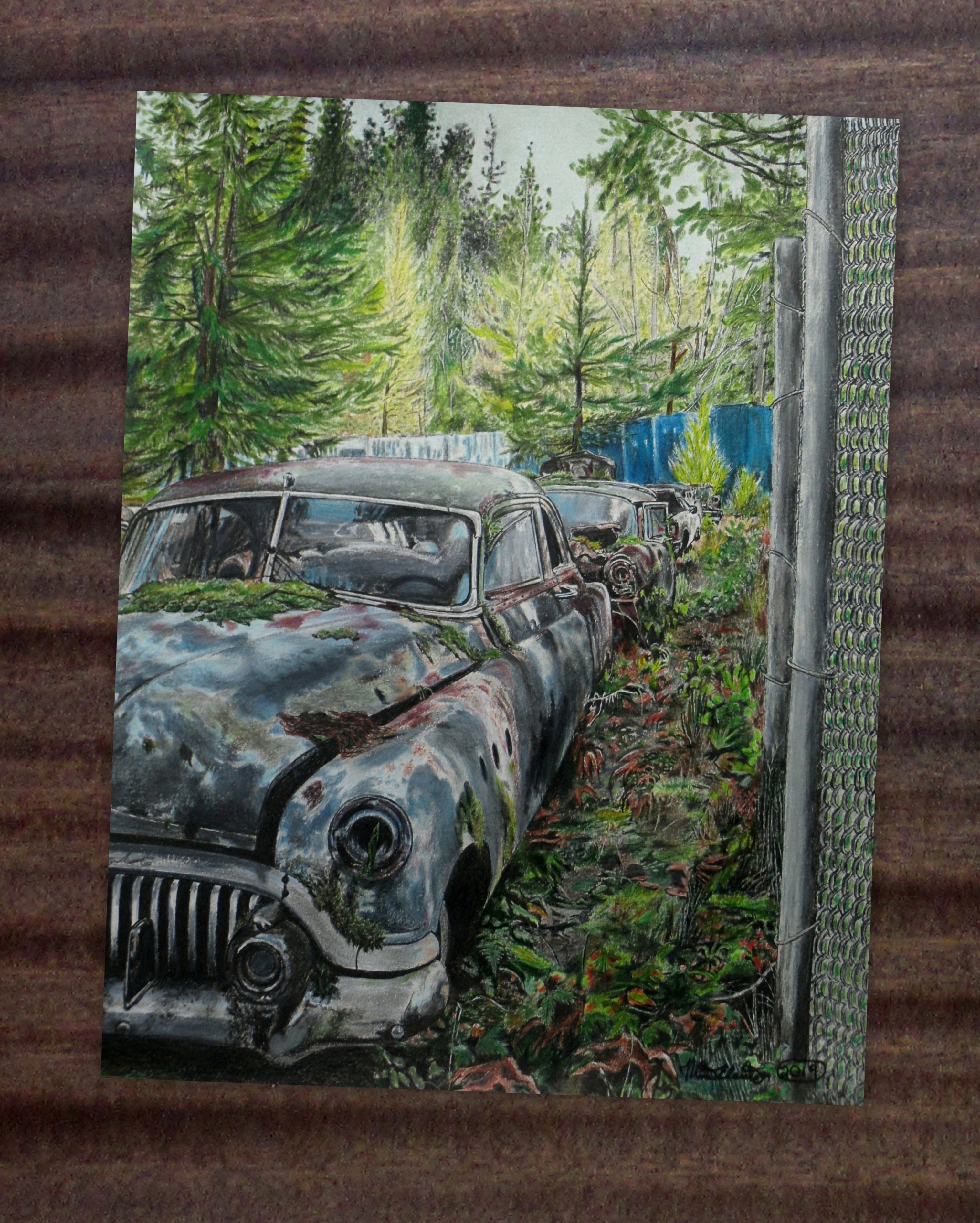 depicts an old Buick Eight in a line of classic cars parked along a fence line in a