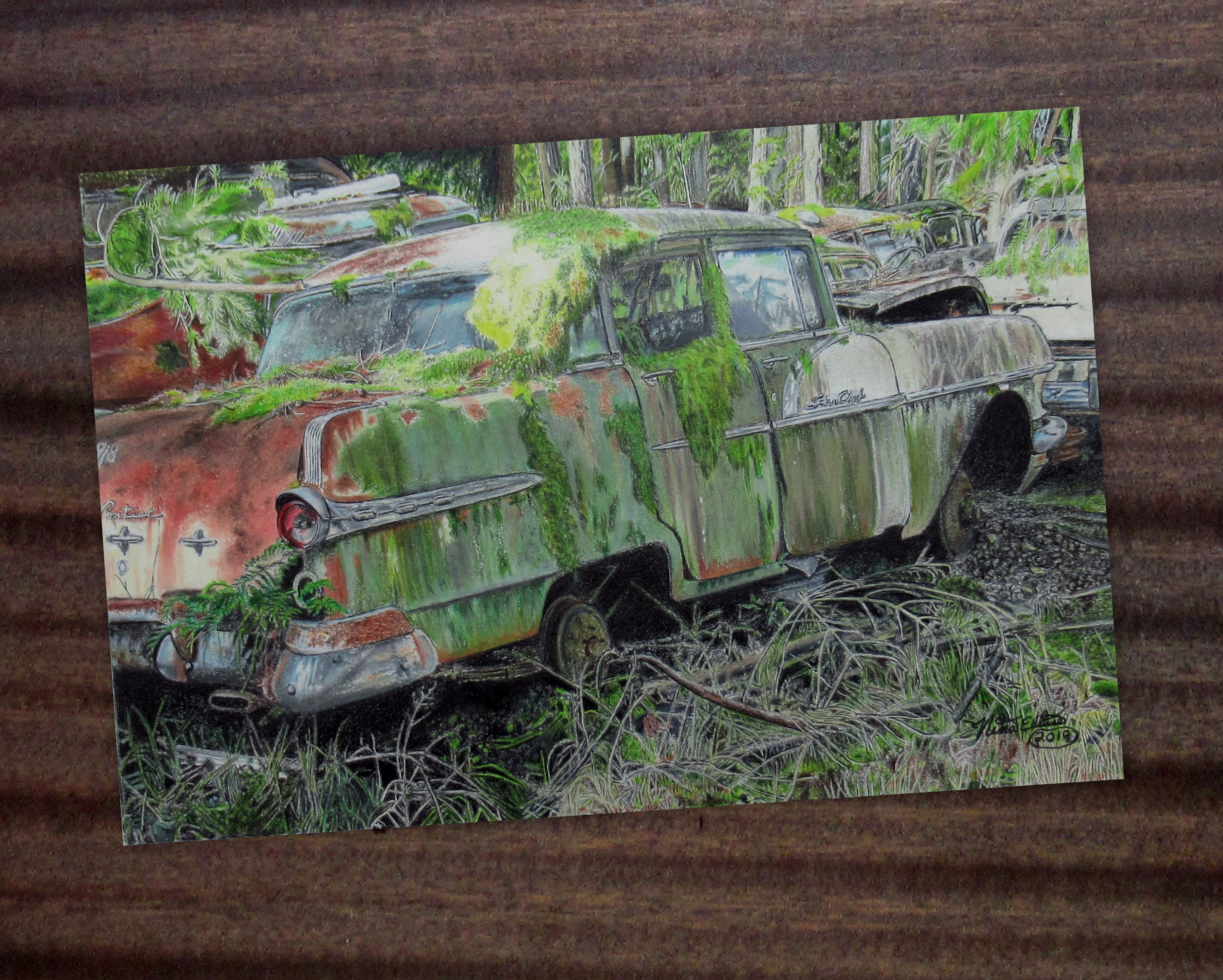 depicts a classic 1956 Pontiac Star Chief sitting in a salvage yard.