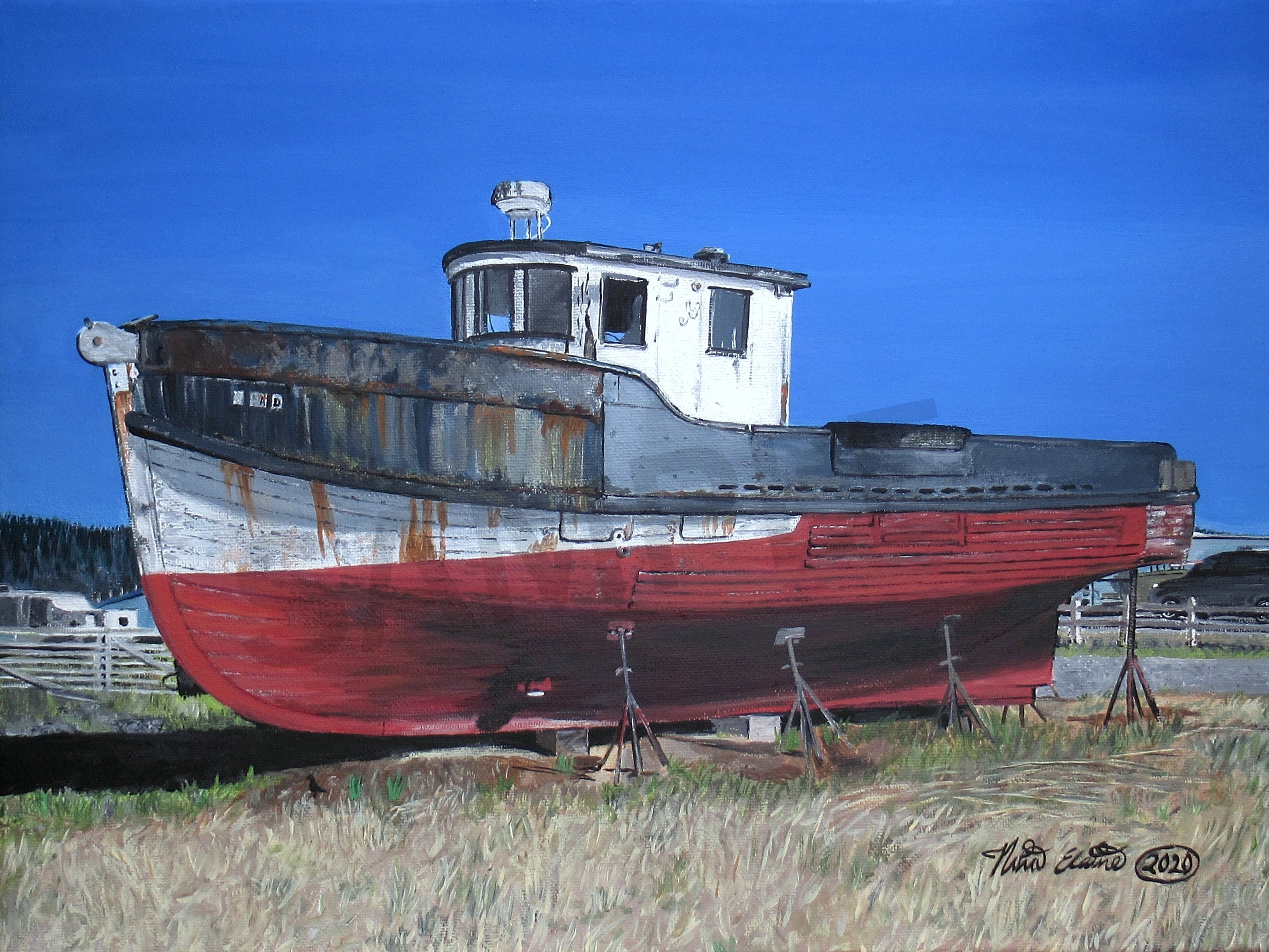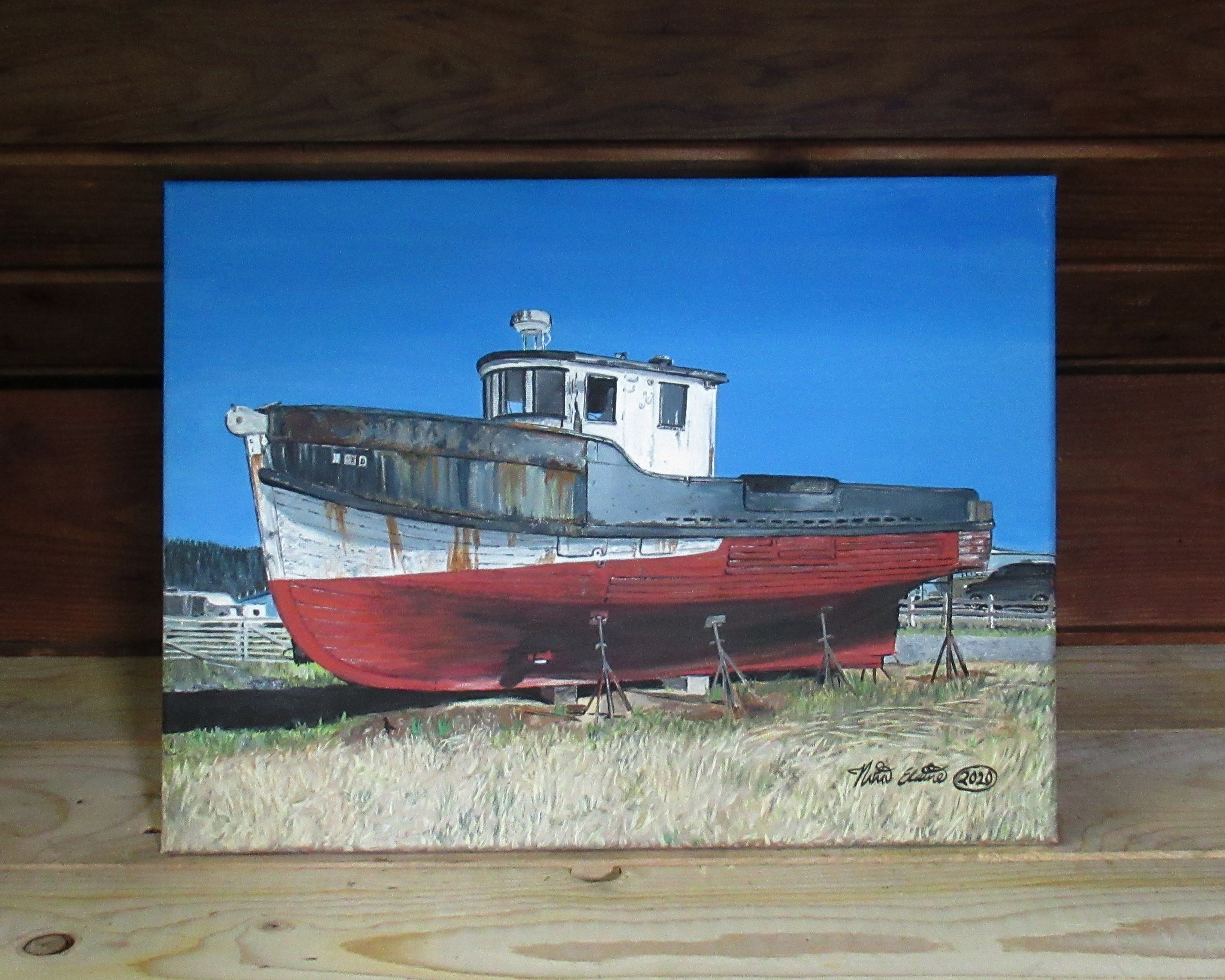 This is the original artwork, titled "Crescent City Boat". Hand painted and signed by the artist N.E.Thompson. Acrylic painting on stretched canvas, size 12x16 inches.This artwork depicts an old fishing boat rusting in a beach town in Northern California. Includes a certificate of authenticity.