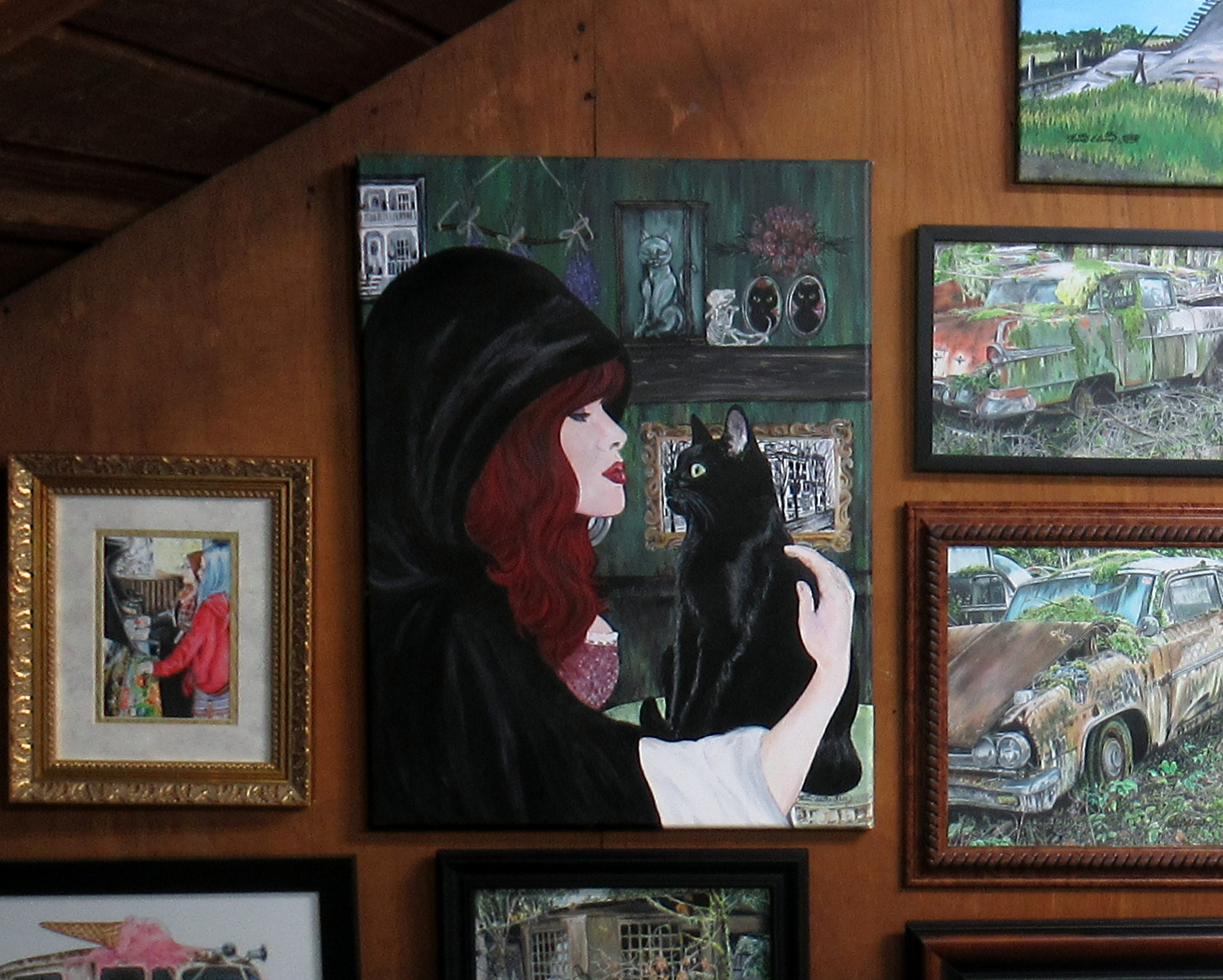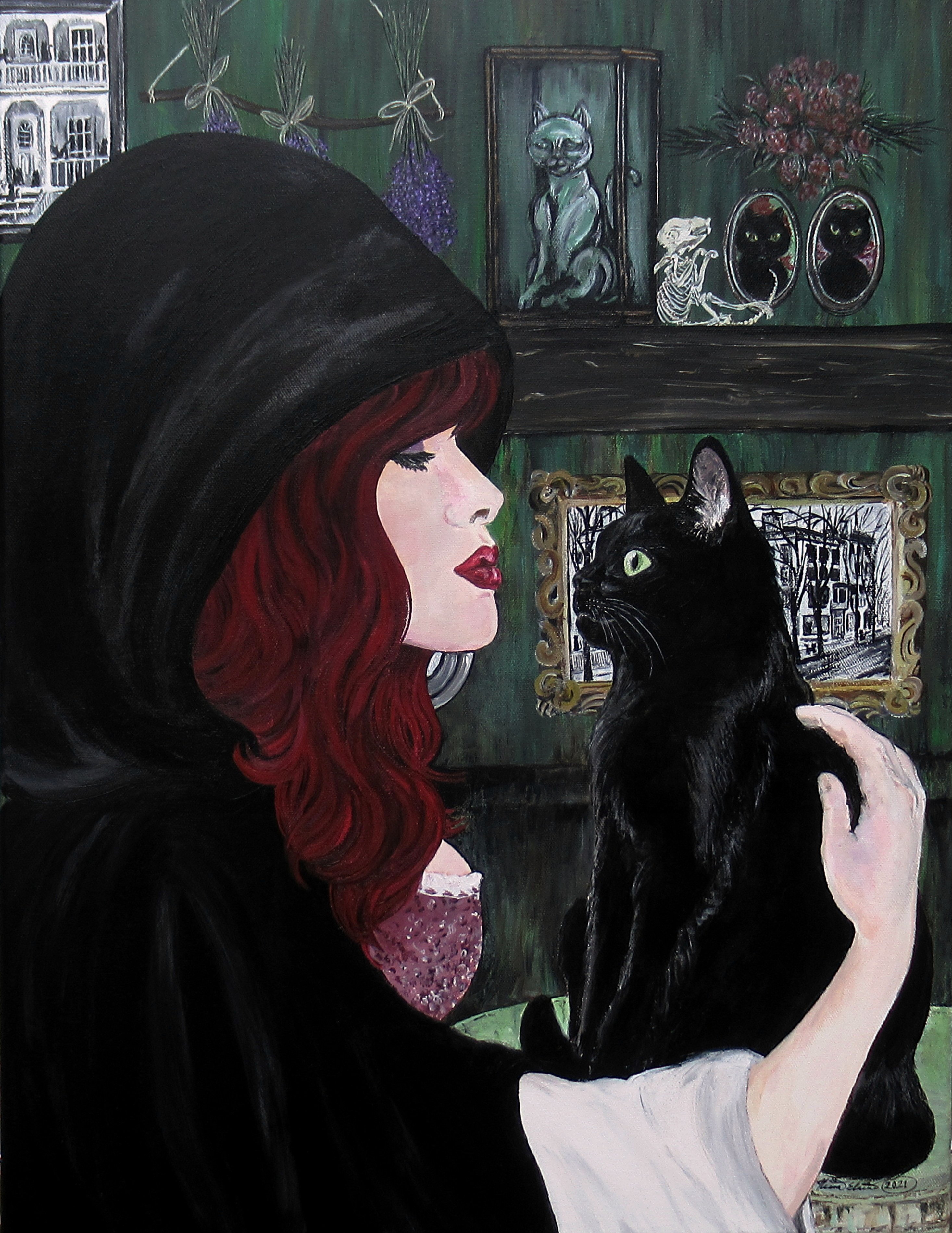 This artwork features a cloaked woman petting a black cat. Black cats are also scattered around in the background details of the painting.