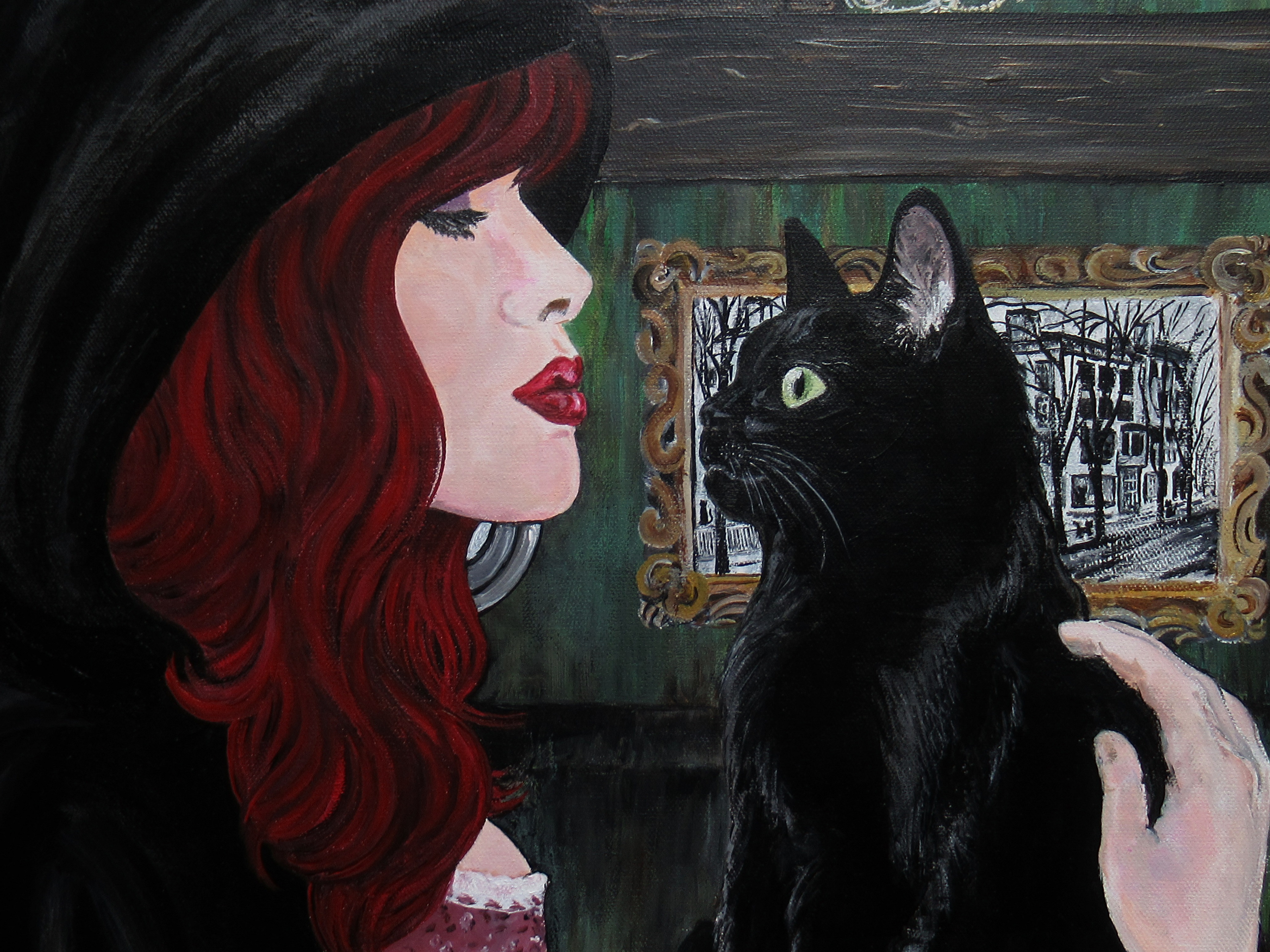This painting is meant to inspire black cat adoption and love, since many black cats have trouble getting adopted to loving homes, due to false superstitions about them.