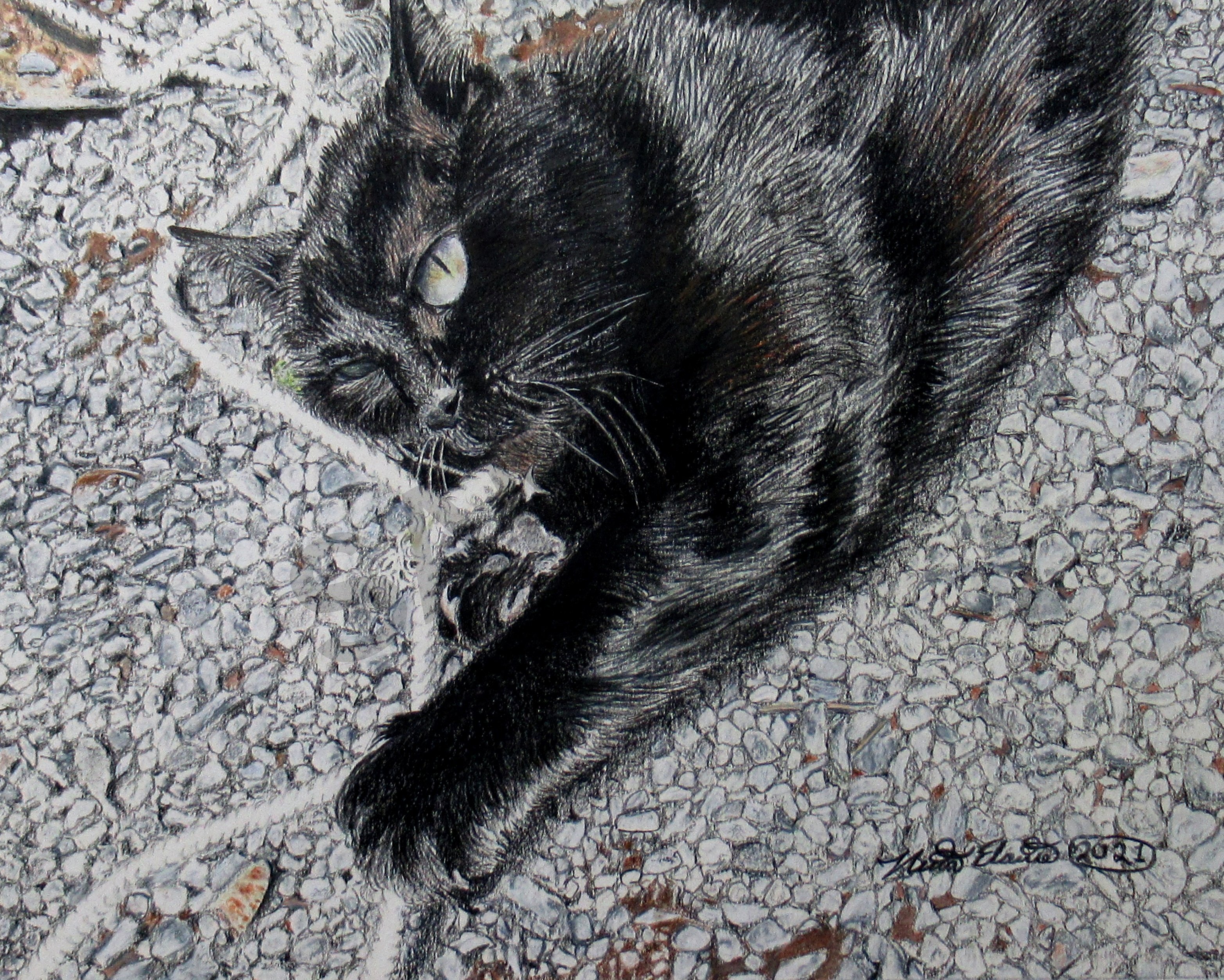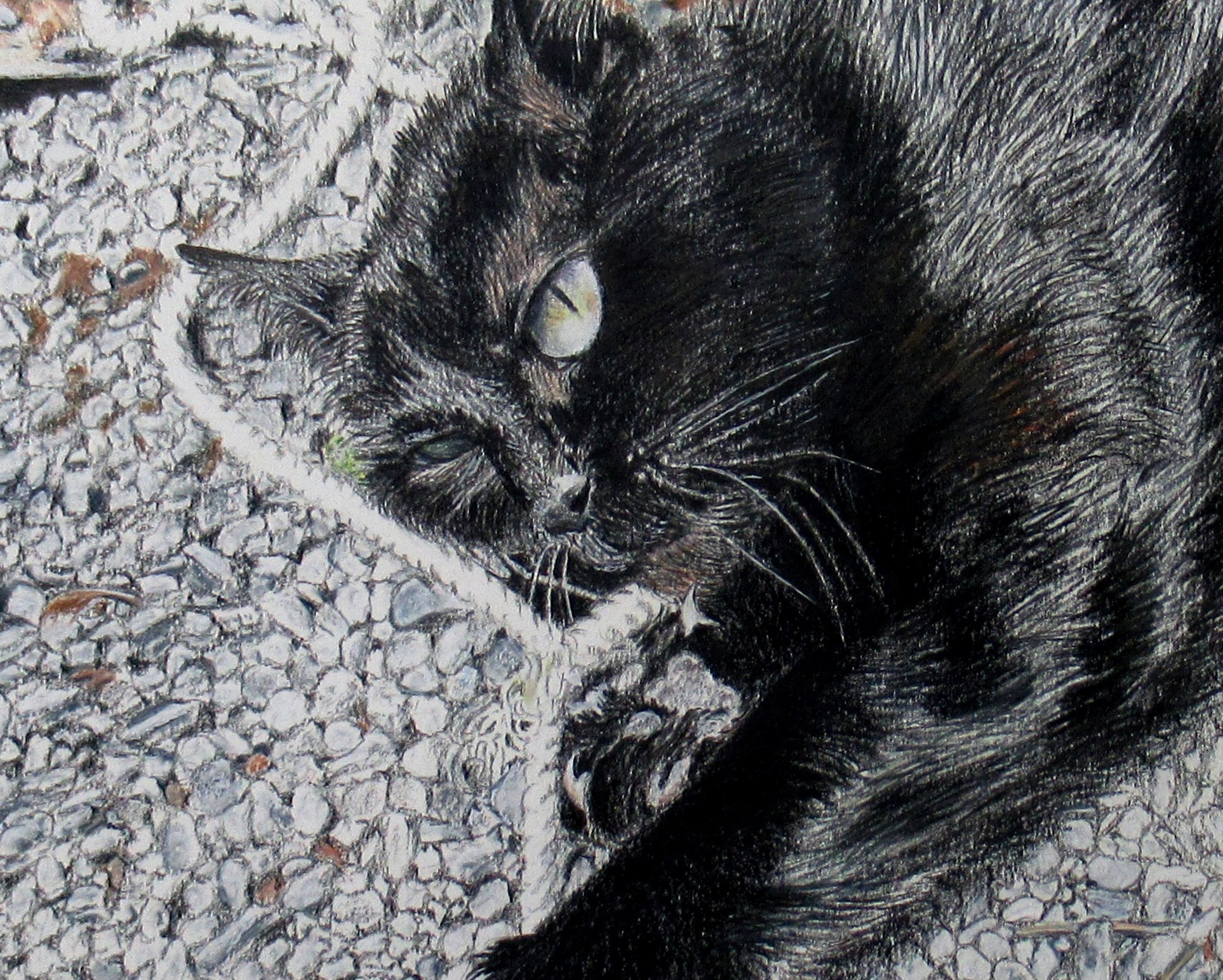 Original drawing titled "Go Play Outside". A realism drawing created with colored pencils on a durable 140lb watercolor paper, size 8X10 inches. Featuring a black cat playing outside with a rope found on the ground. Artwork is signed by the artist N.E.Thompson. Includes a certificate of authenticity