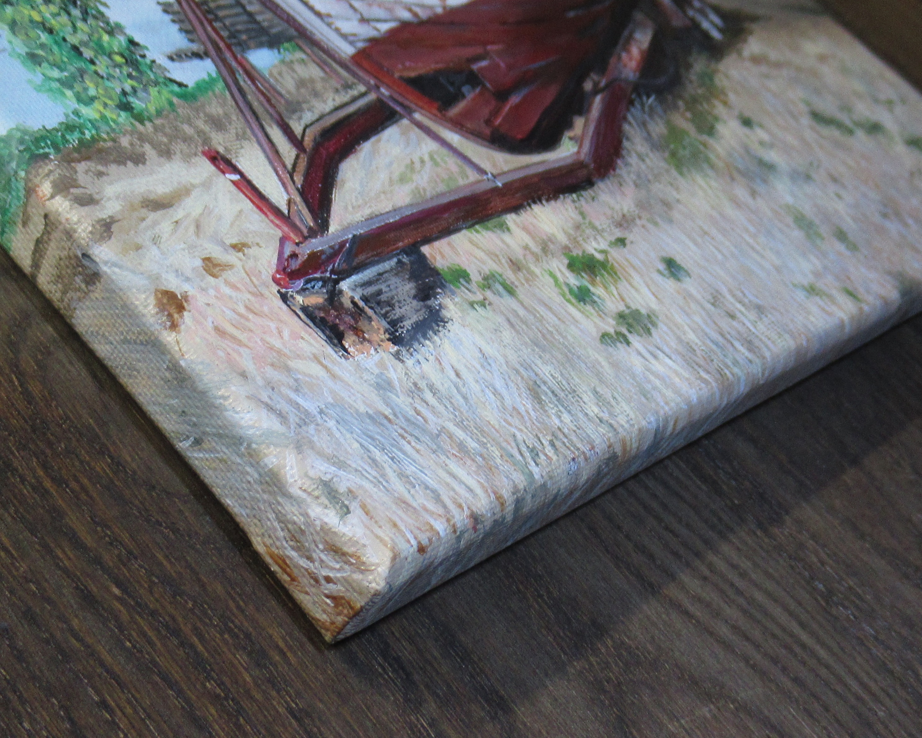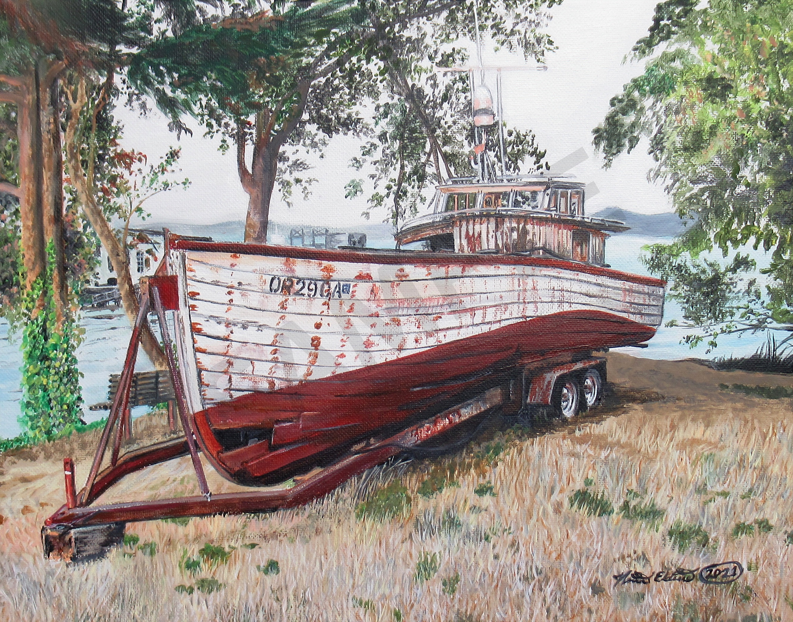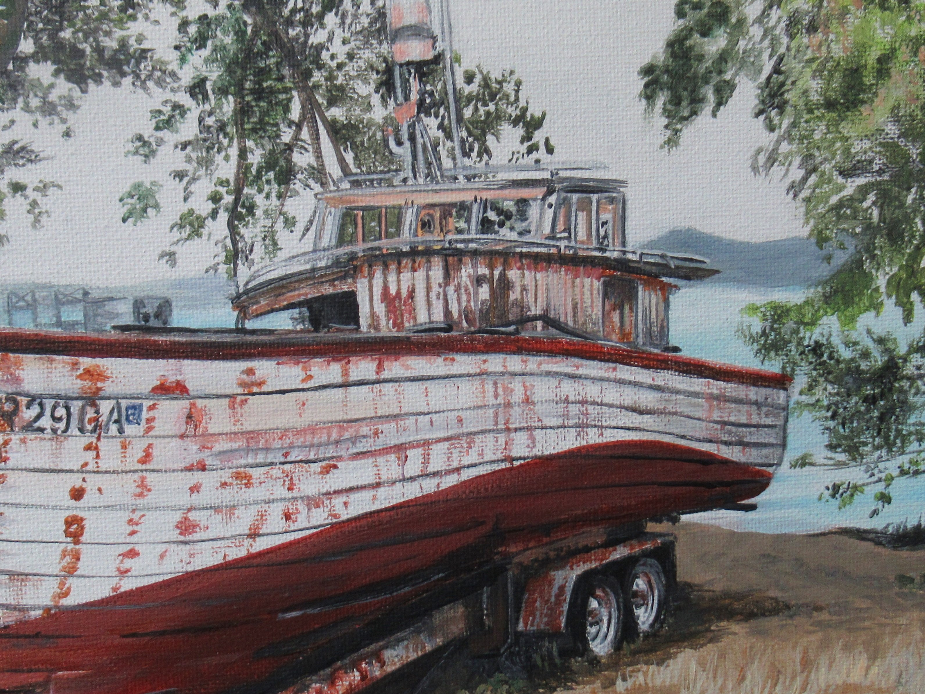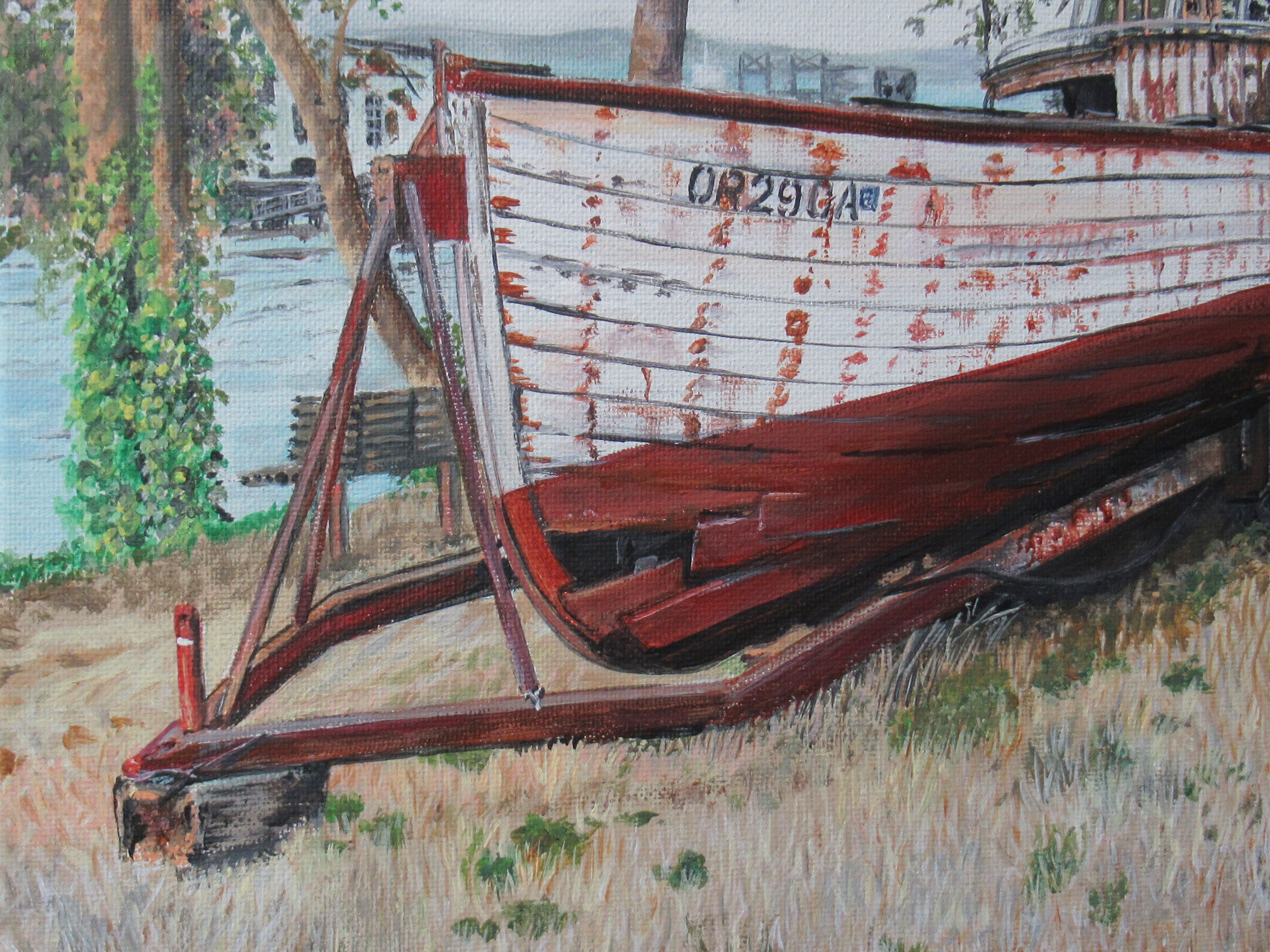 This is the original artwork, titled "River Walk". Acrylic painting on stretched canvas, size 11 x14 inches. This artwork depicts an old boat from the 1940's sitting along the Columbia River in Astoria, Oregon, and was inspired by the beauty of that area.