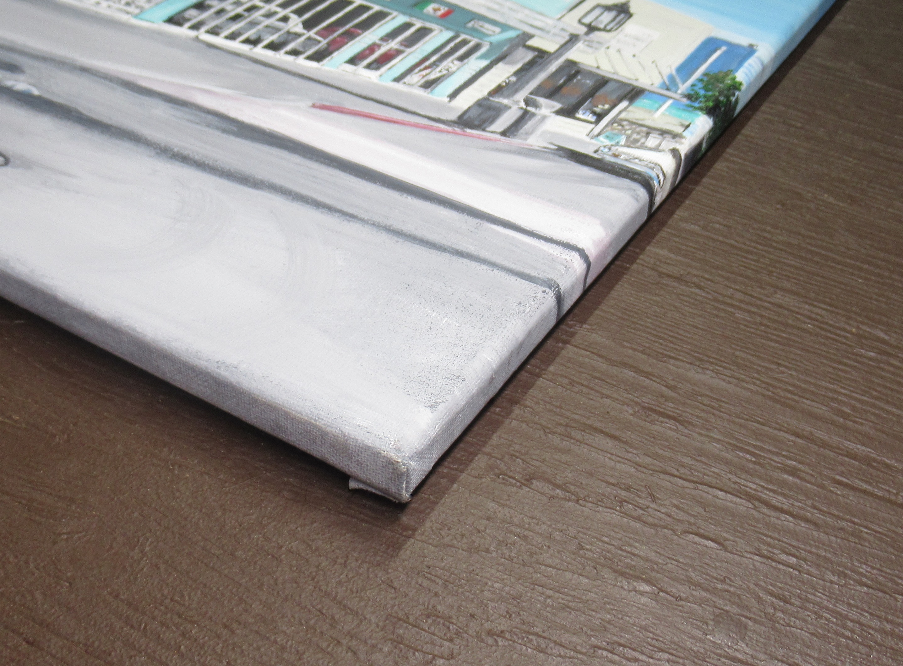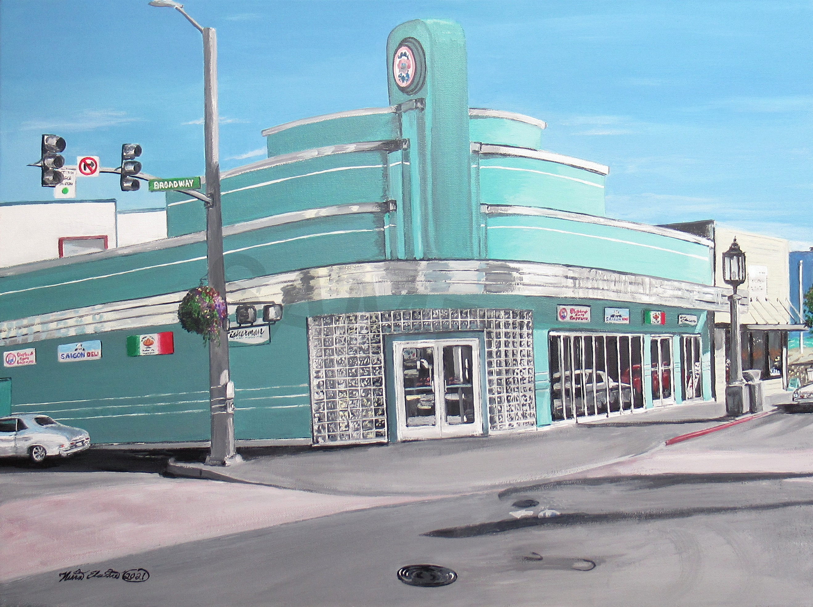 This artwork features an art deco style building located on Broadway Street, in Seaside, Oregon.