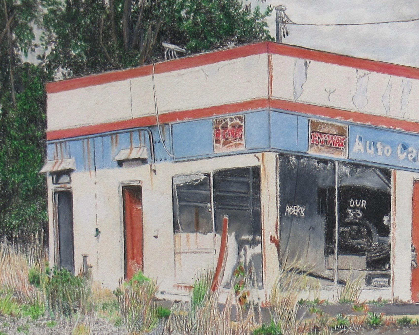 This artwork features an abandoned auto care shop. A realism piece, drawn in the hopes of capturing the essence of these old places before they're torn down and cease to exist.