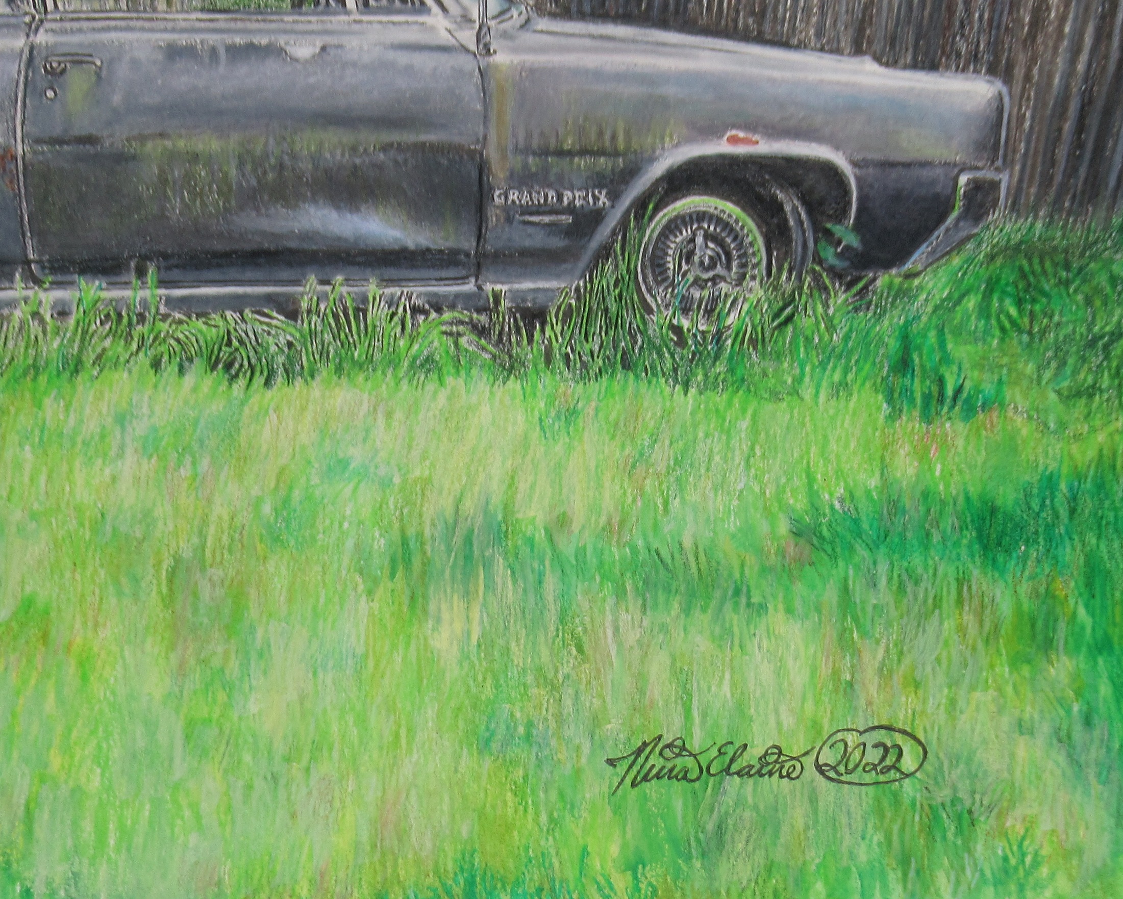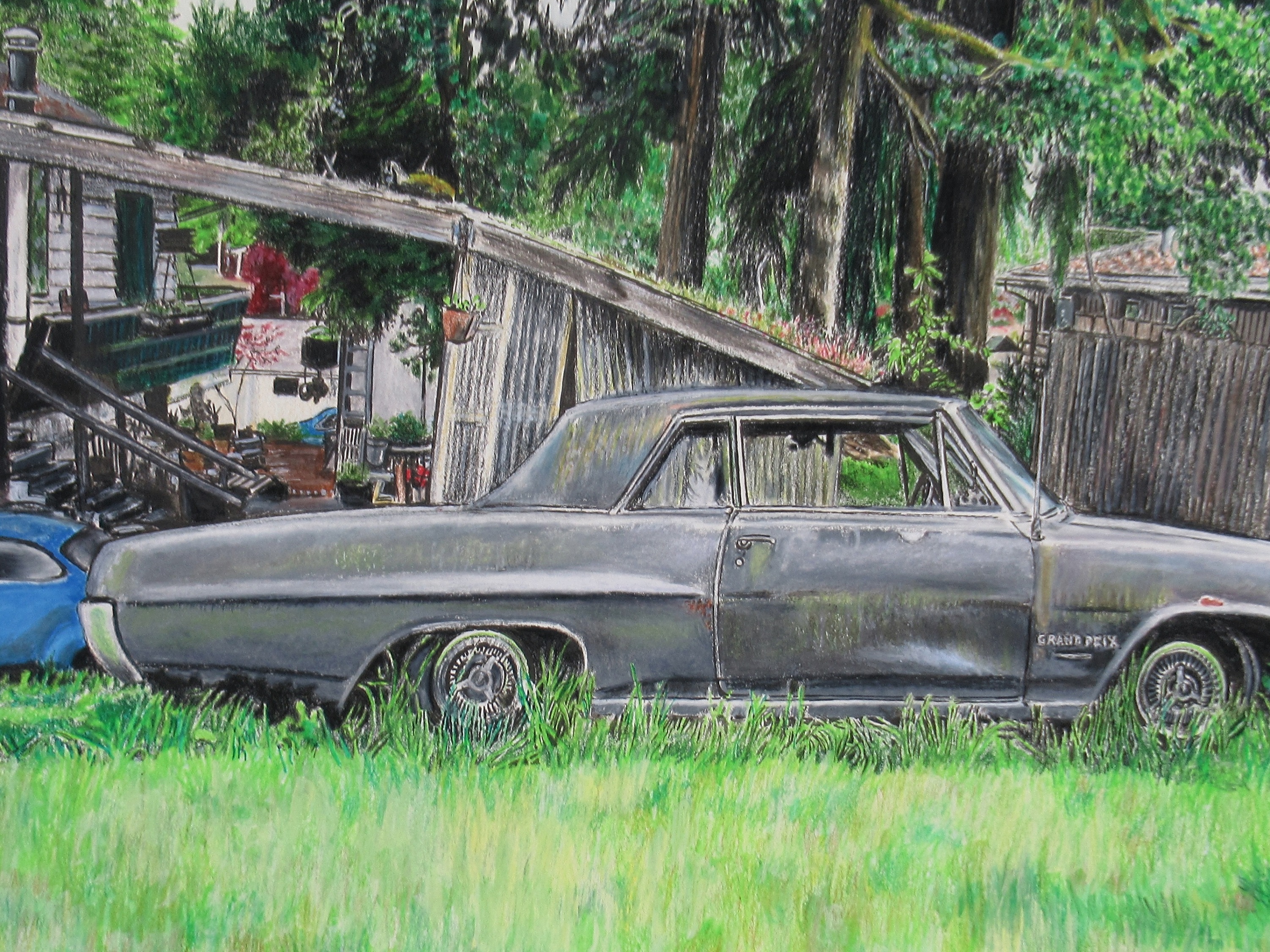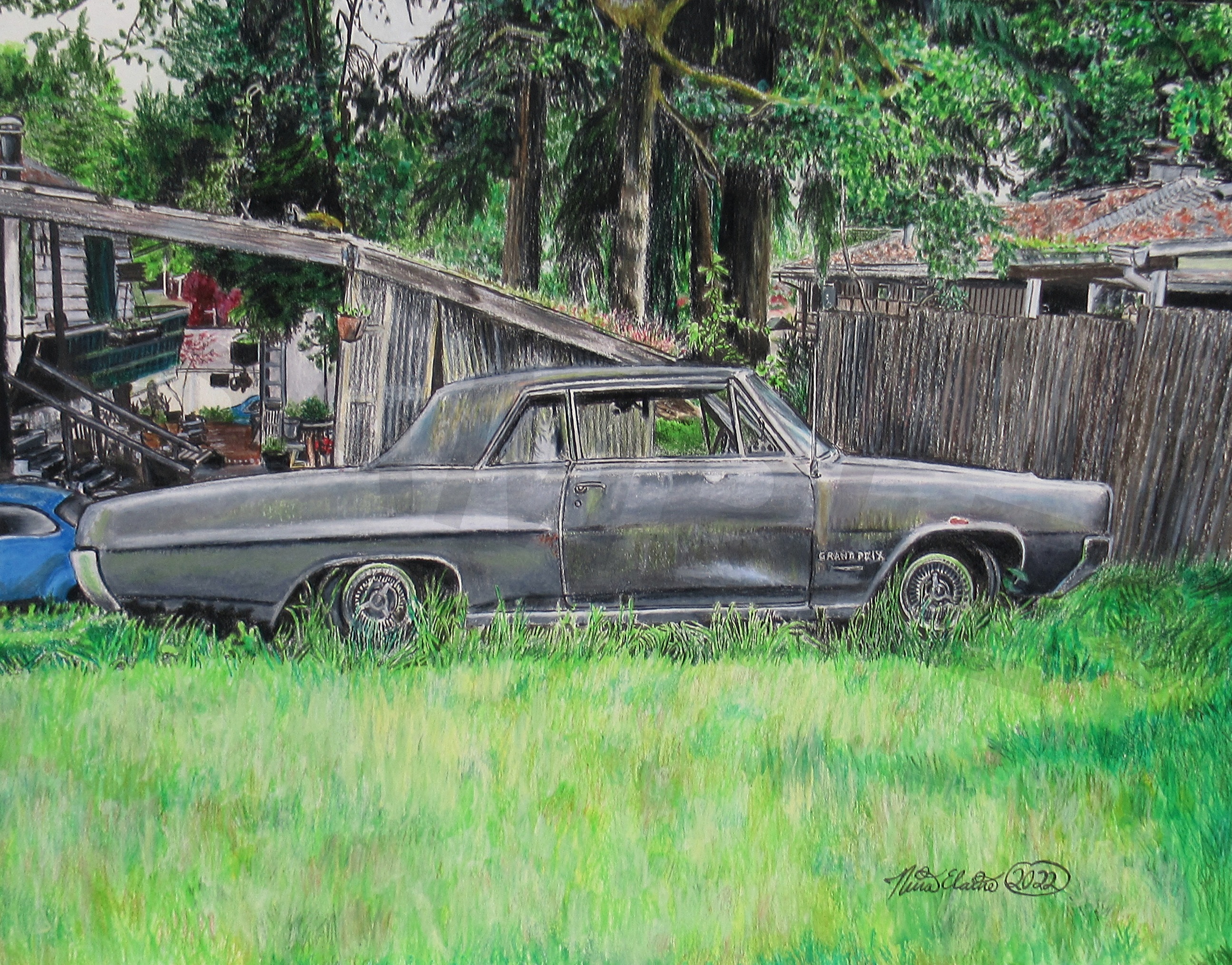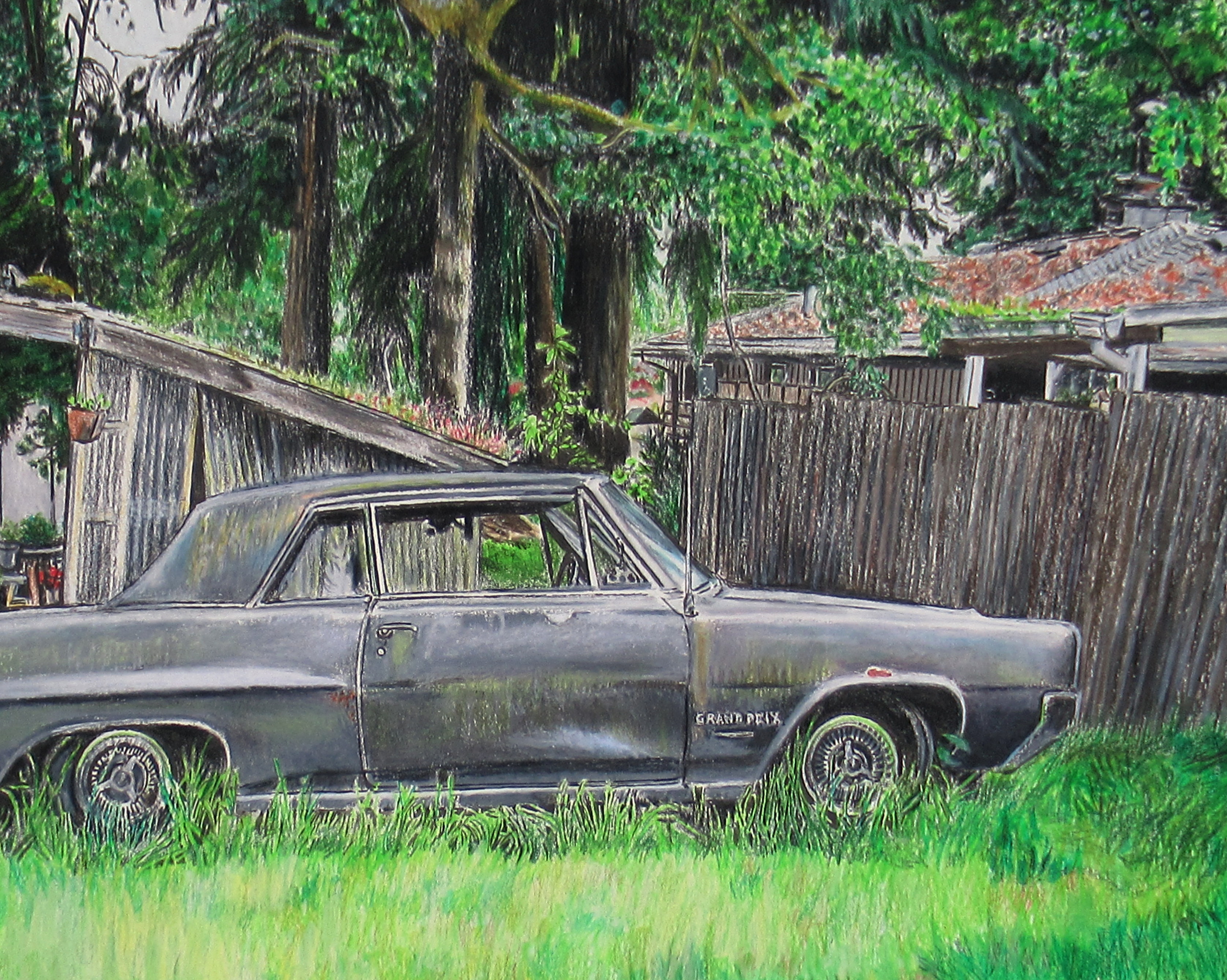This artwork features a 1964 Pontiac Grand Prix, living the lawn ornament life.