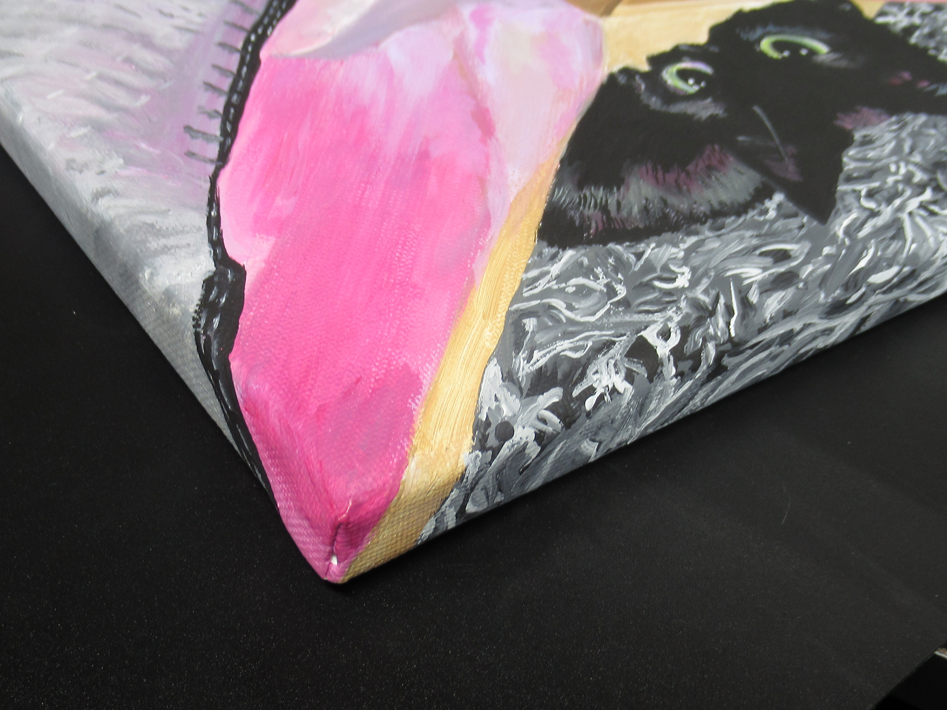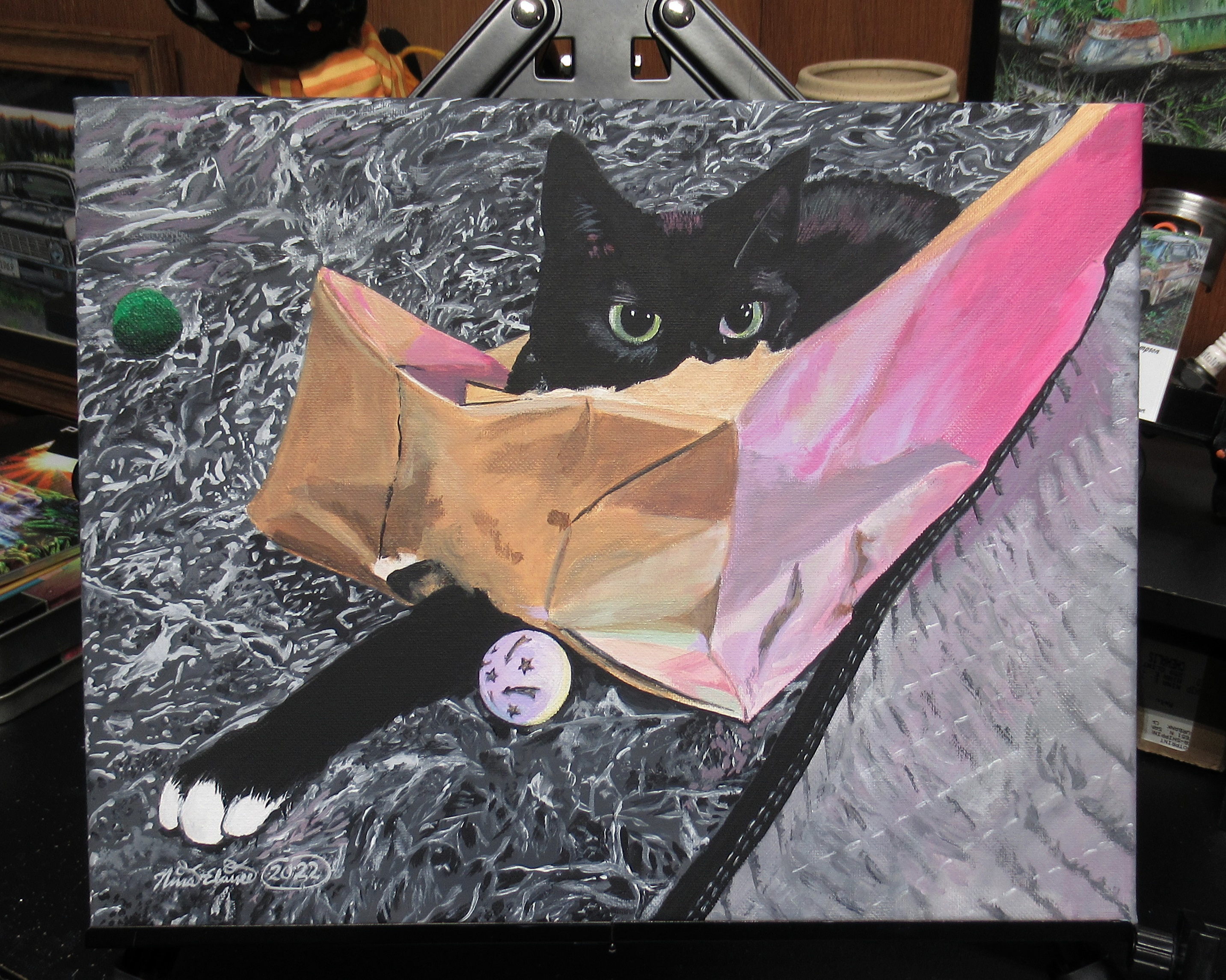 Artwork featuring a black cat. This "Little Bag Lady" has demolished another paper bag in the pursuit of her cat toy.