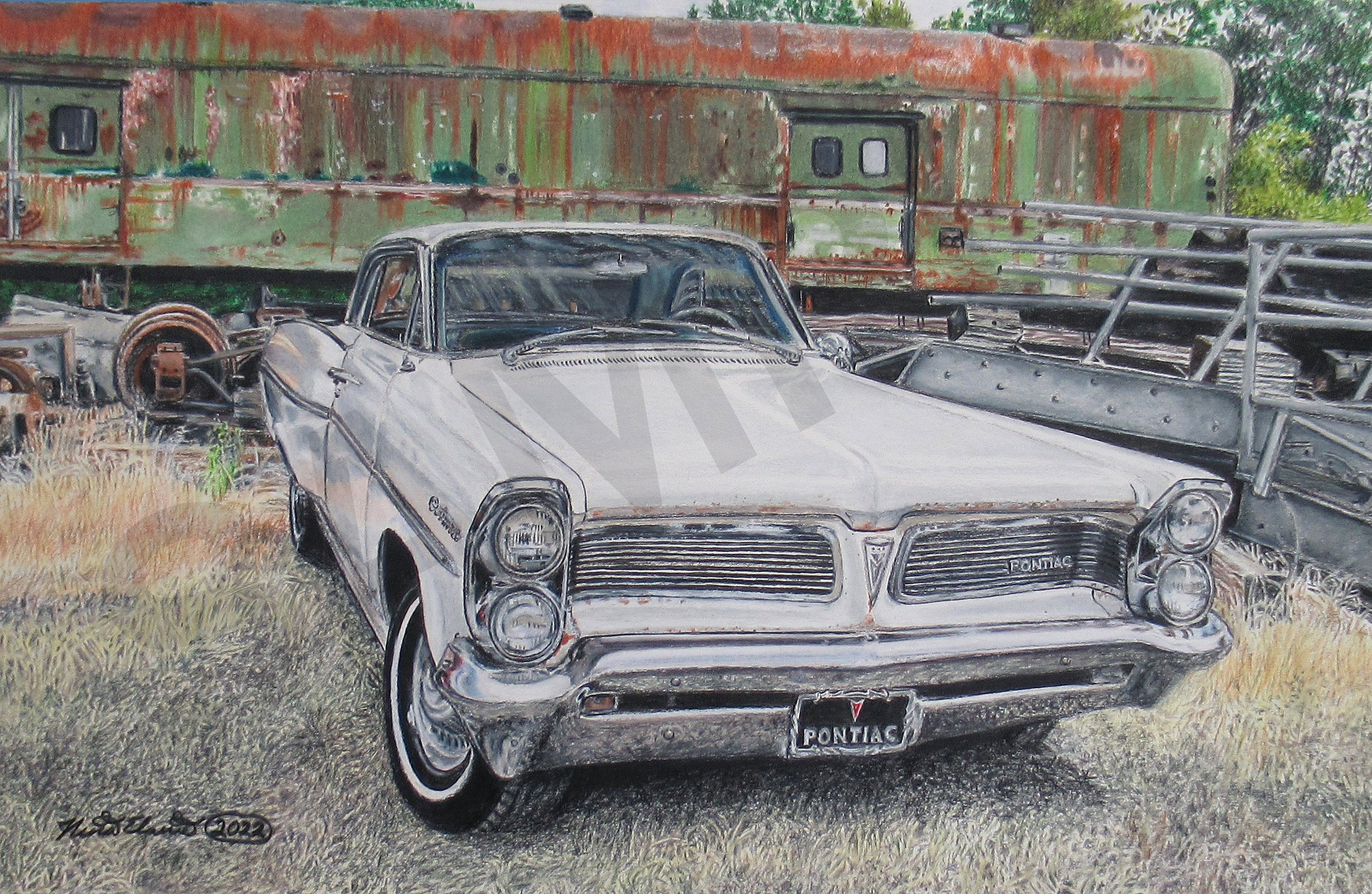 The artwork, by N.E.Thompson, features a 1963 Pontiac Catalina parked in front of a rusted out train car in South West Washington.