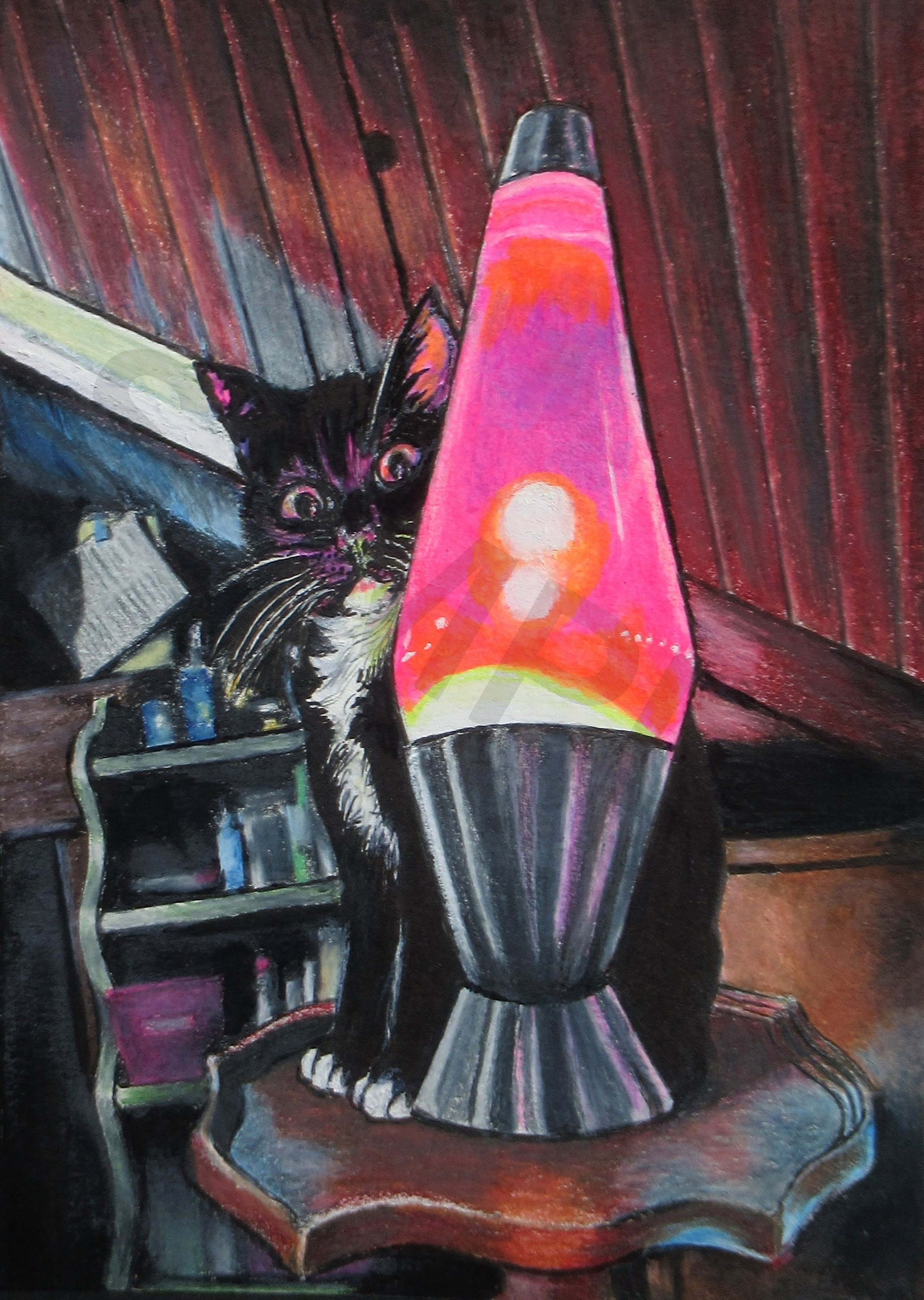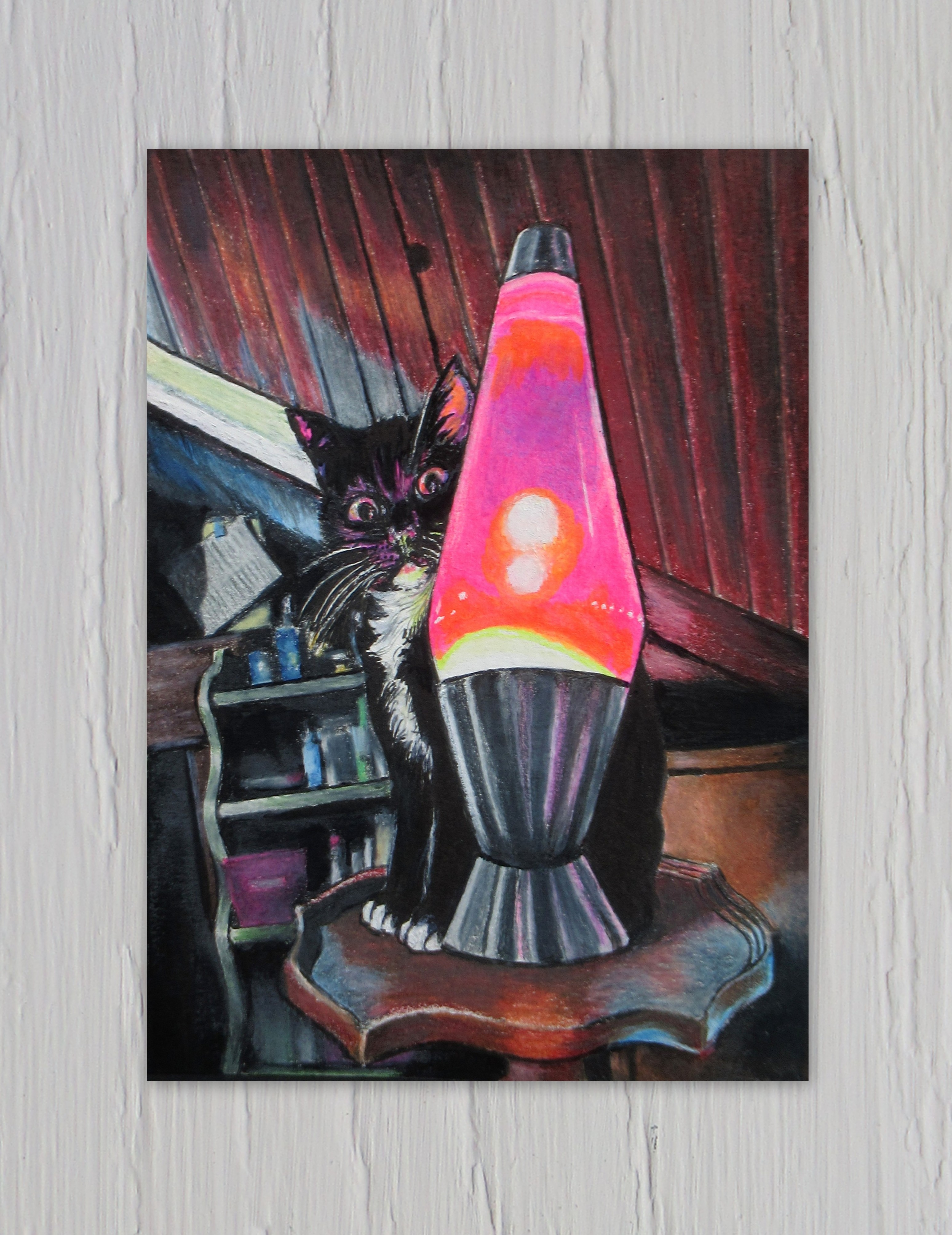 The artwork features a little kitten lurking in the darkness behind a lava lamp.