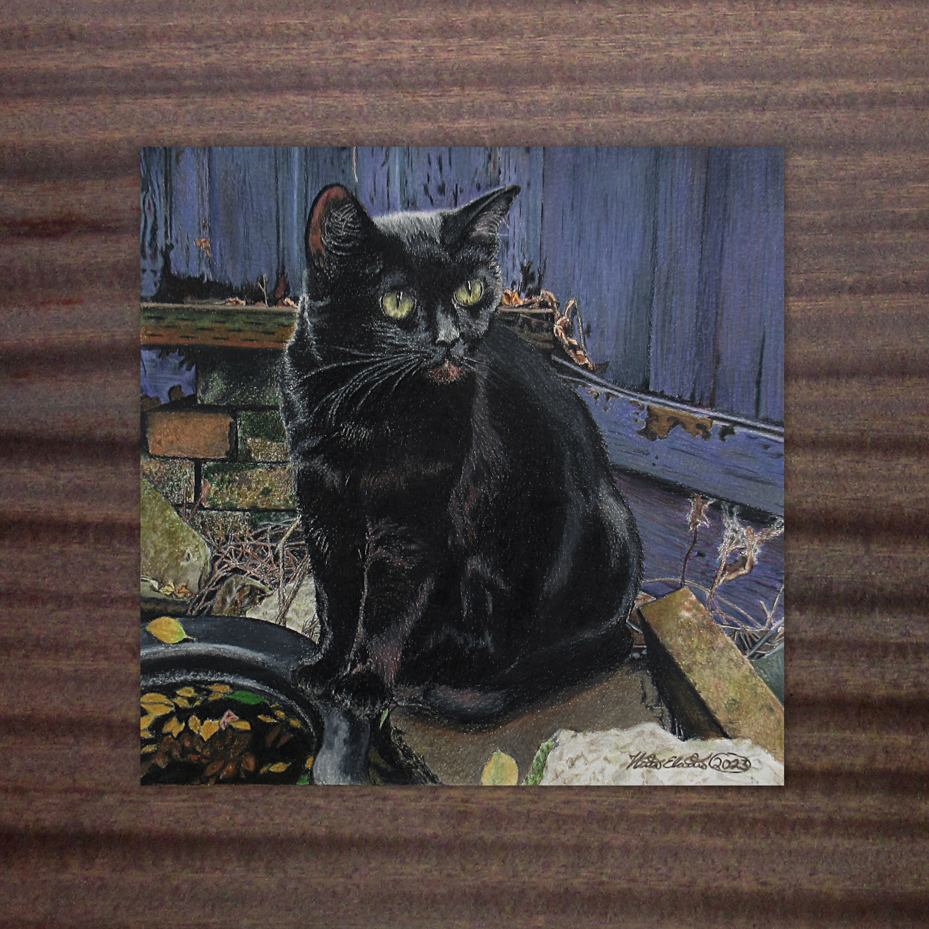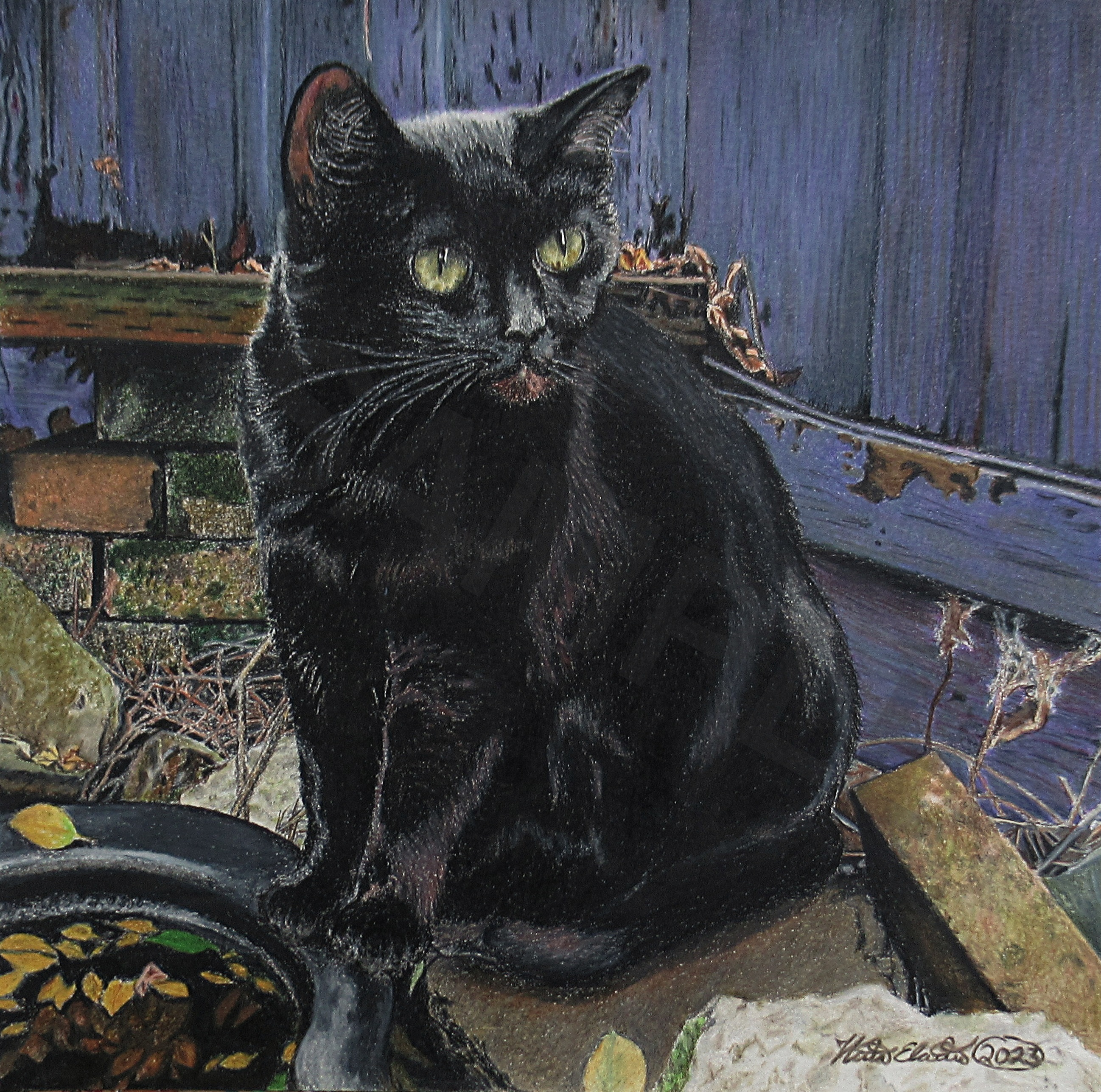The artwork features a black cat who's come out at dusk to hunt and drink from a near by pond.