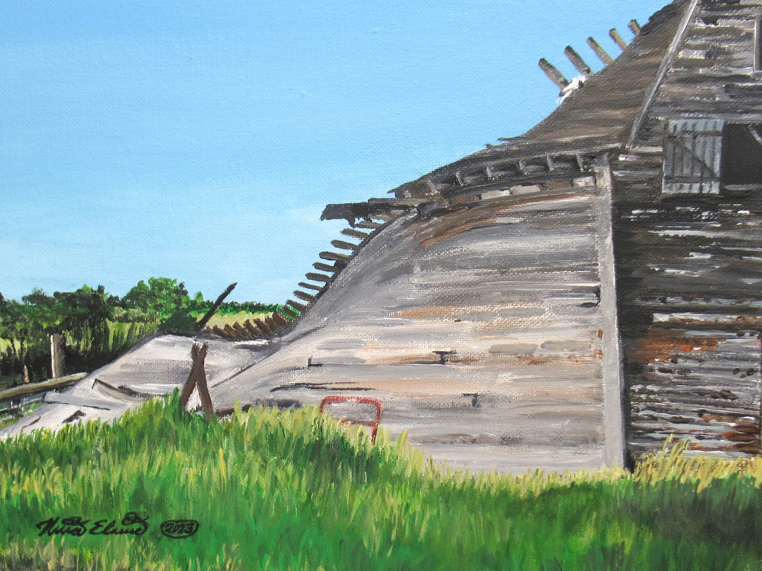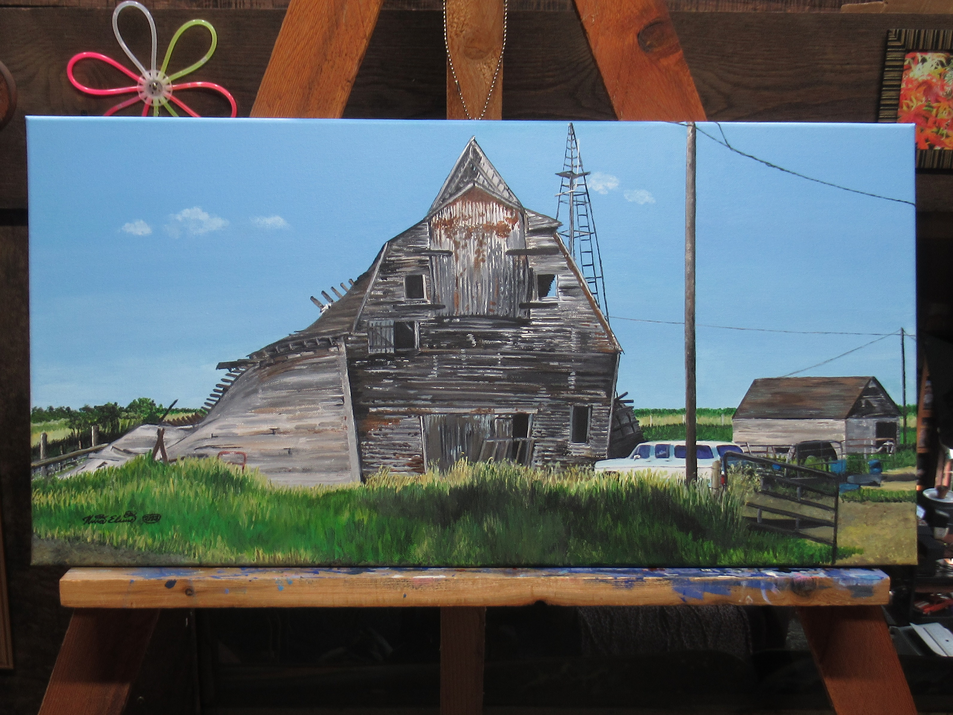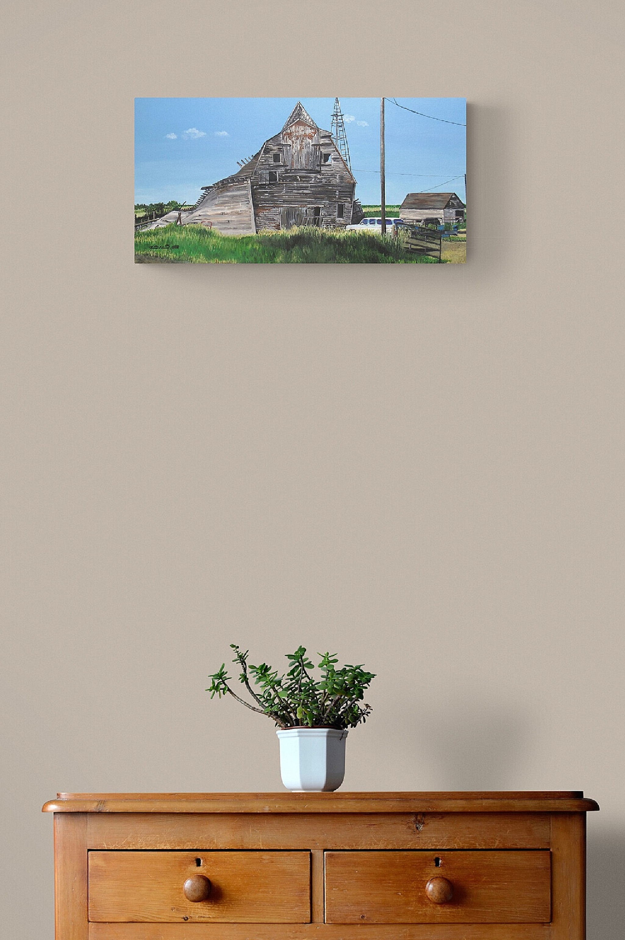 This artwork depicts a rural farm scene with a dilapidated barn collapsing in on itself, captured before it takes it's last breath. Acrylic painting on stretched canvas, size 15x30 inches. Includes a certificate of authenticity.