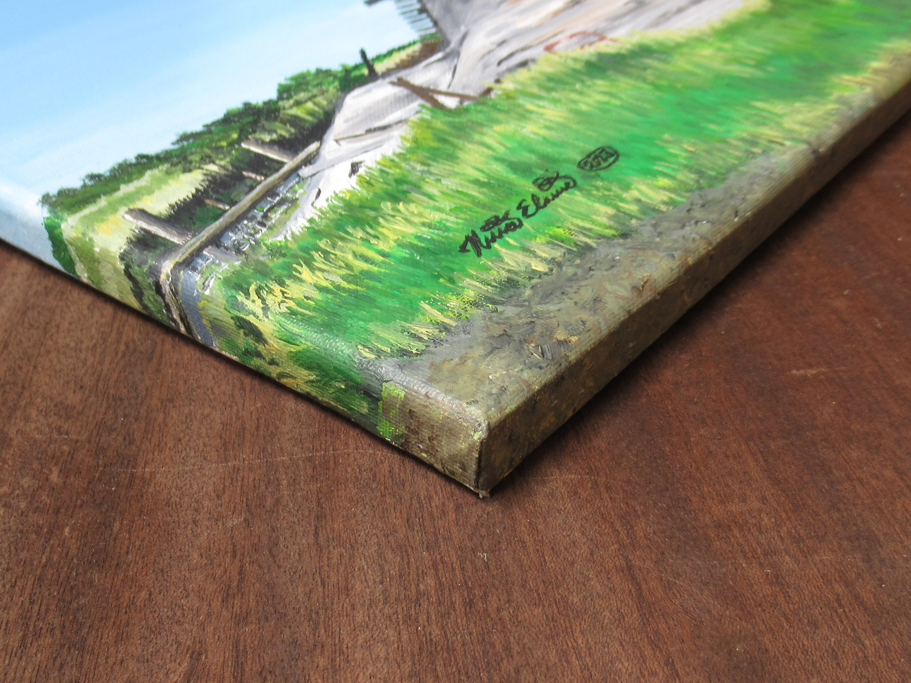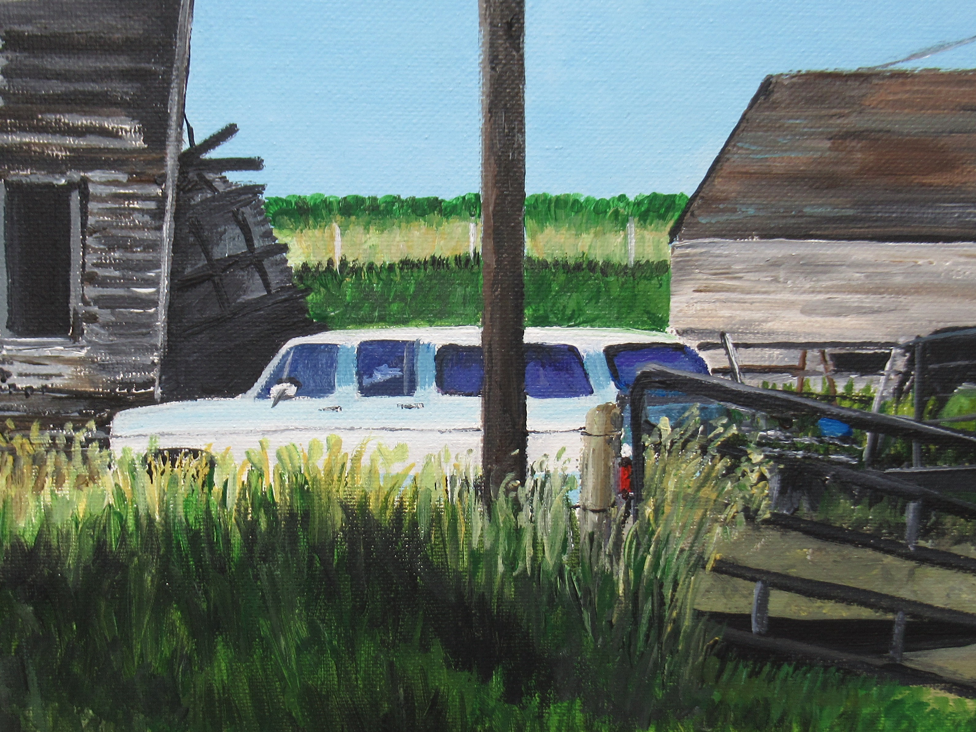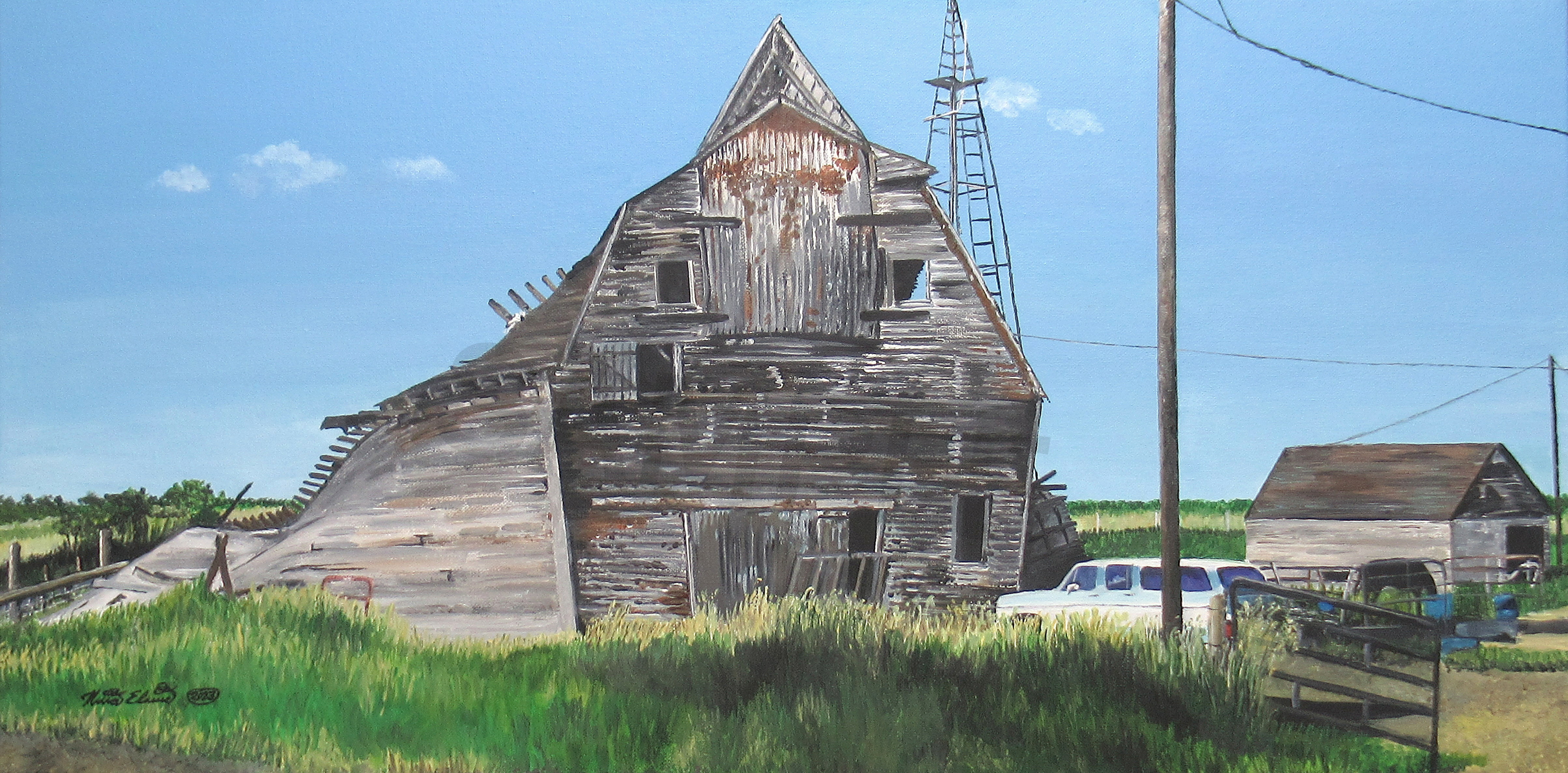 This artwork depicts a rural farm scene with a dilapidated barn collapsing in on itself, captured before it takes it's last breath. Acrylic painting on stretched canvas, size 15x30 inches. Includes a certificate of authenticity.