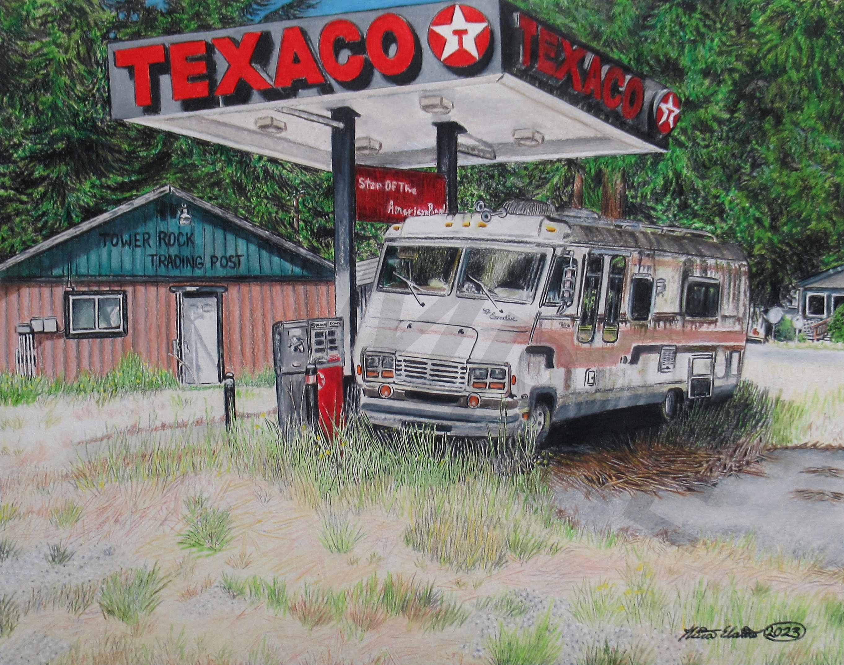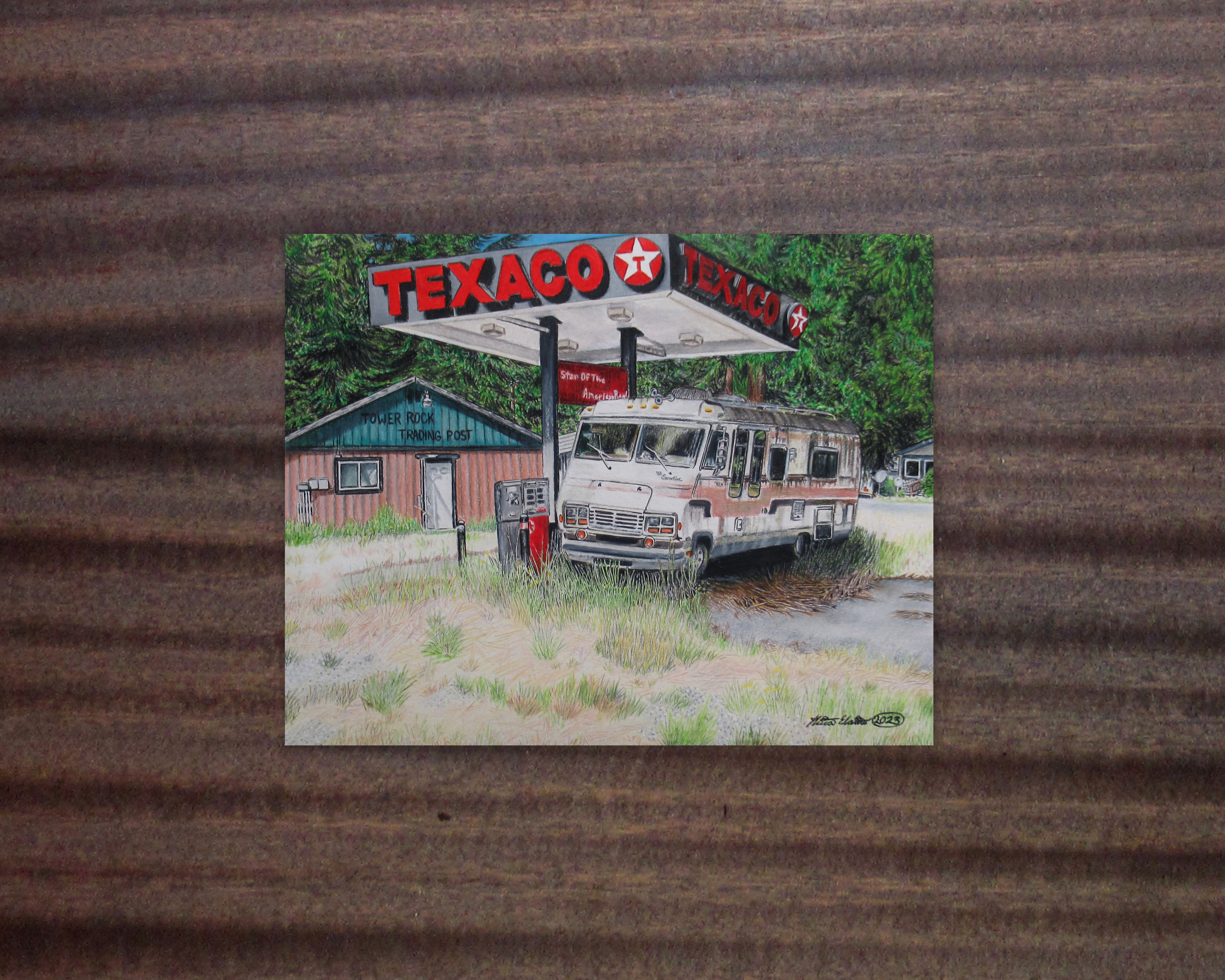 The artwork, by N.E.Thompson, depicts a rural scene of a stranded motorhome at an abandoned gas station, hidden near the end of a dead end road in the pacific northwest.