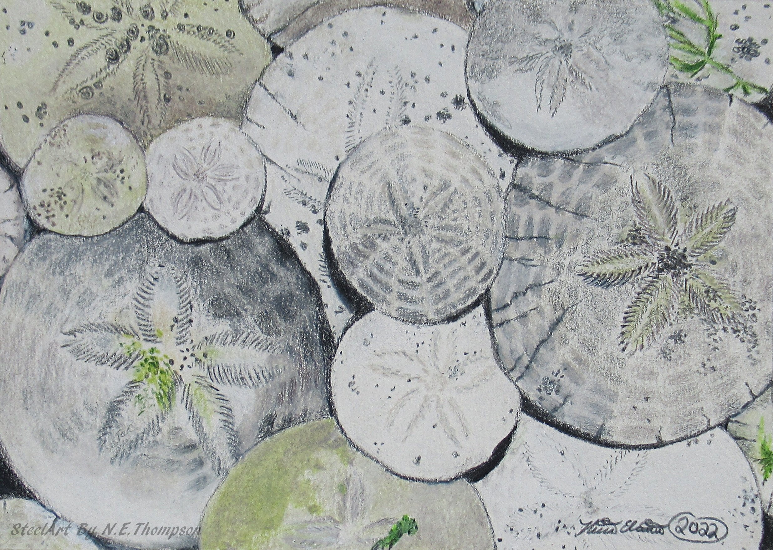 The original artwork by N.E.Thompson features a pile of sand dollars found while beach combing.