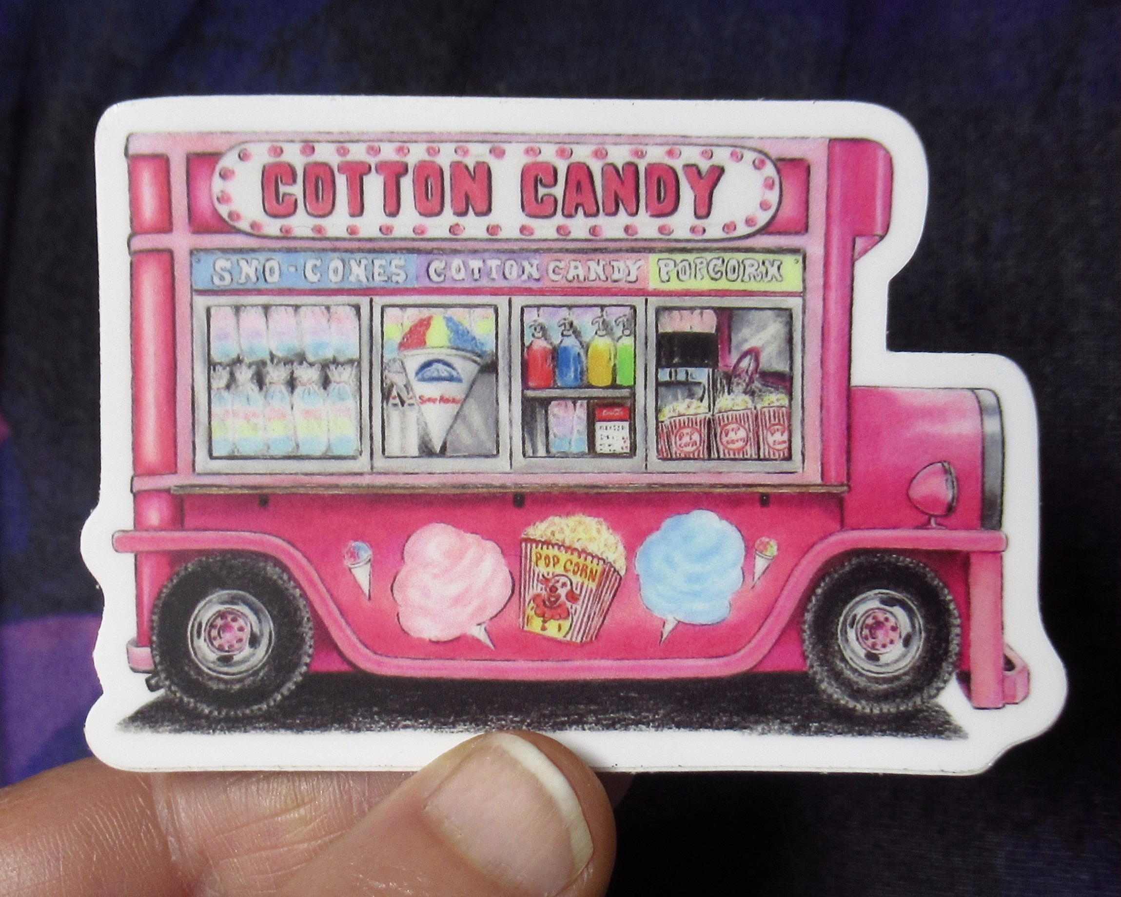 Cotton Candy Truck, 3" x 2.07" die cut sticker. Thick, durable vinyl stickers resistant to scratches, water, & sunlight. A unique sticker from the Food Truck Series By N.E.Thompson