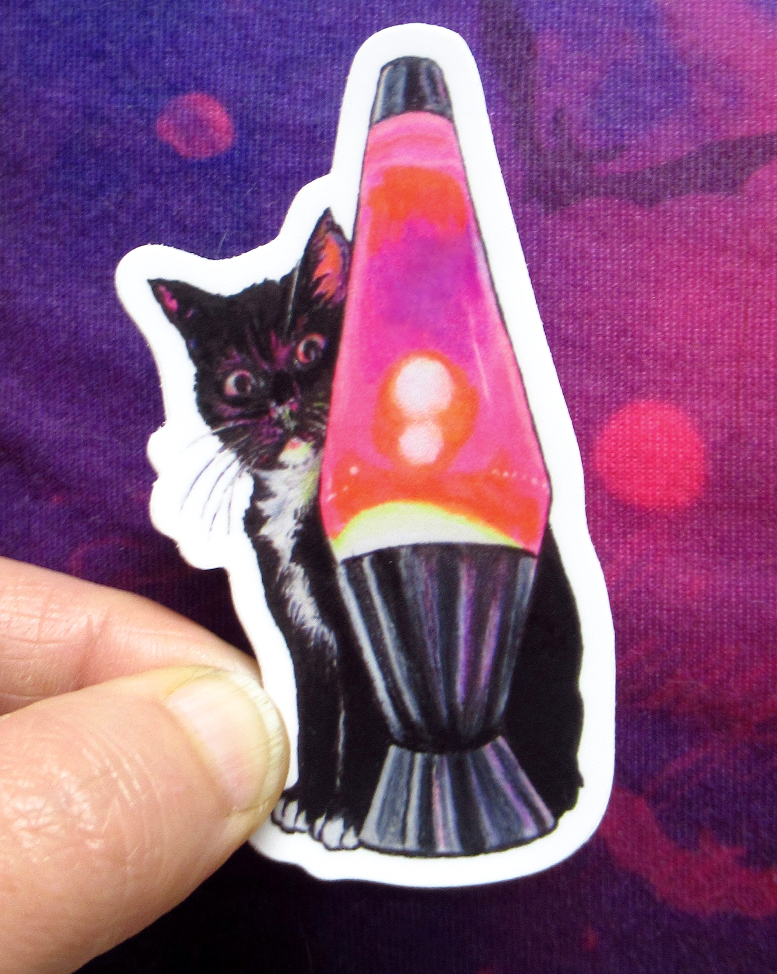 Creeper Kitty And The Lava Lamp 1.66" x 3" die cut sticker. Thick, durable vinyl stickers resistant to scratches, water, & sunlight. A unique sticker from the Black Cat series by N.E.Thompson