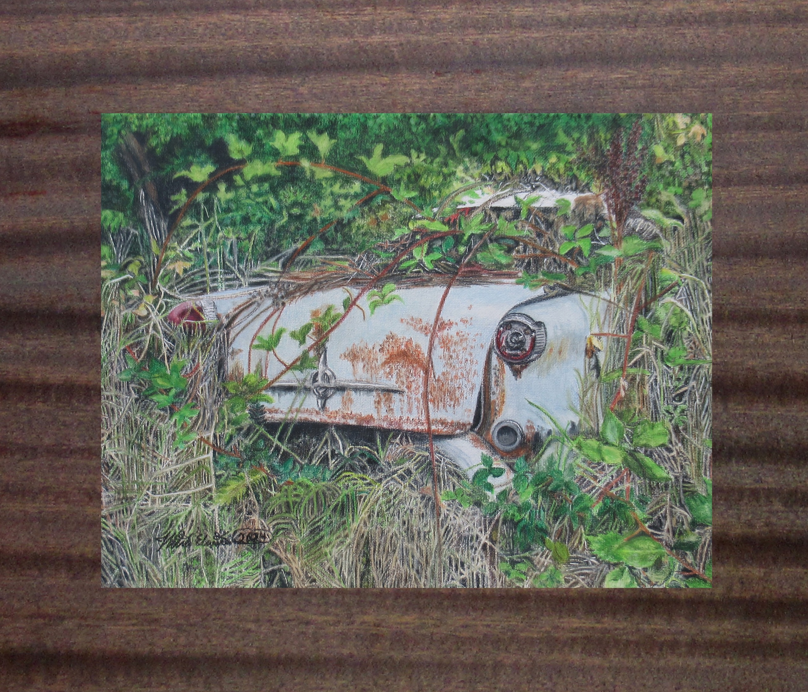 The artwork, by N.E.Thompson, features a classic car engulfed in nature, awaiting rescue by its savior.