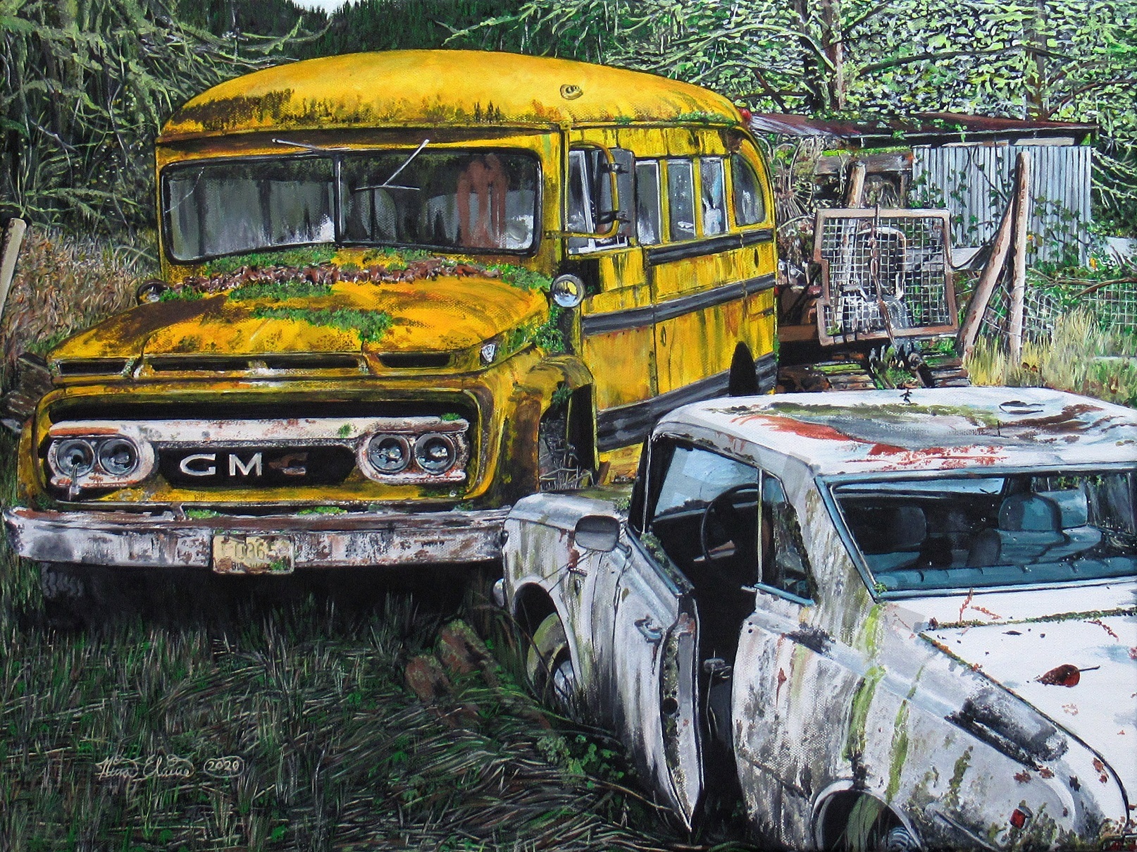 This artwork is a little rural tour by N.E.Thompson, featuring a 1960's GMC crummy bus and a 1969 Corona, locked together in an on-going traffic enigma.