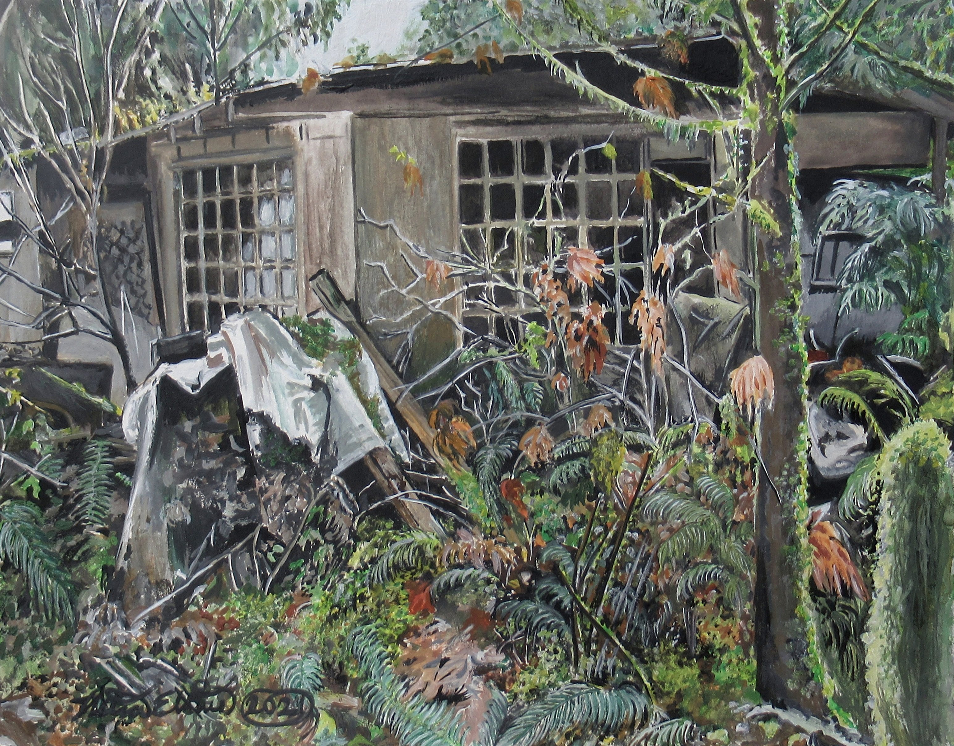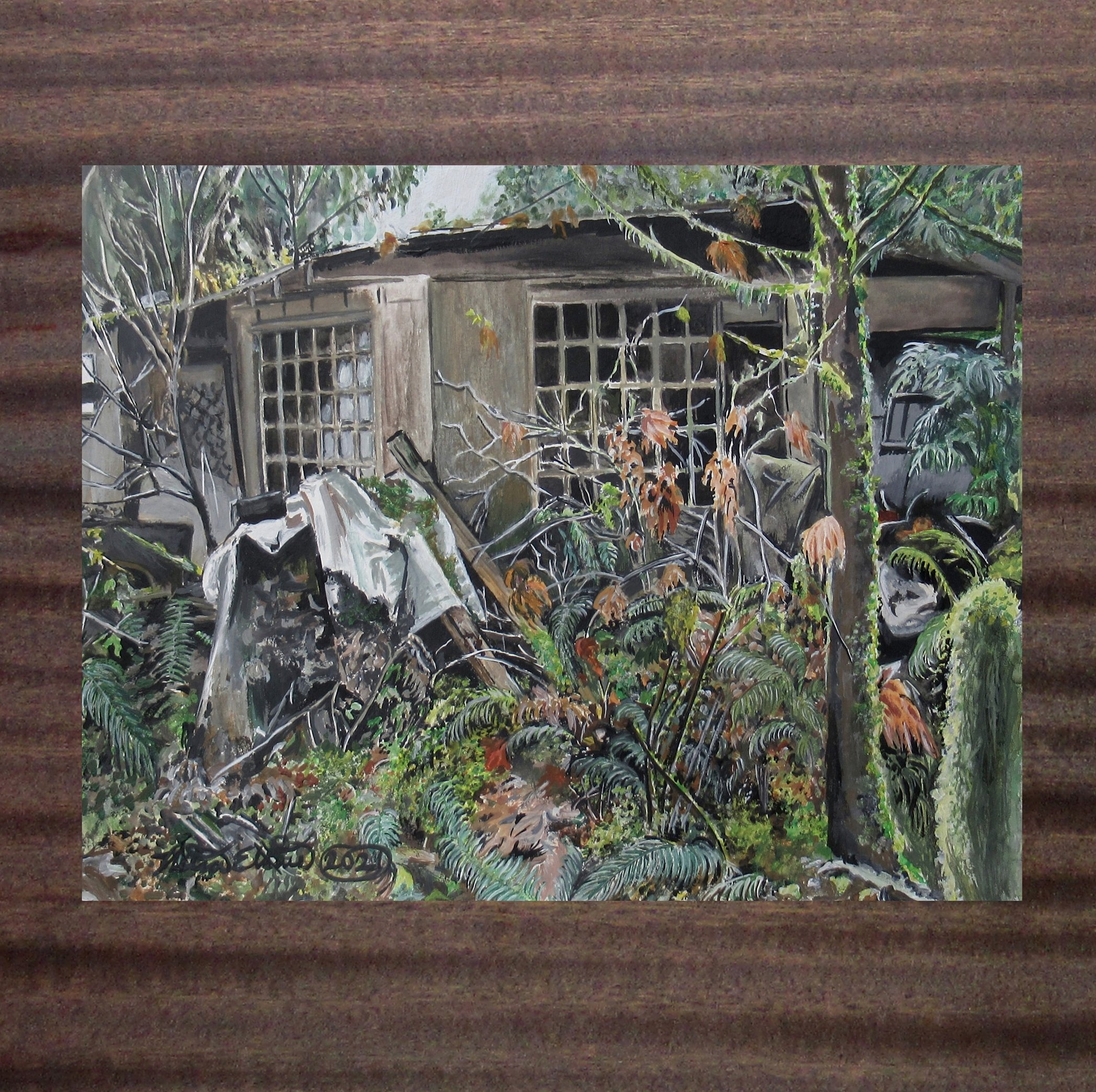 The artwork, by N.E. Thompson, features an old cabin unoccupied since 1998 nestled in the woods of the Pacific Northwest.