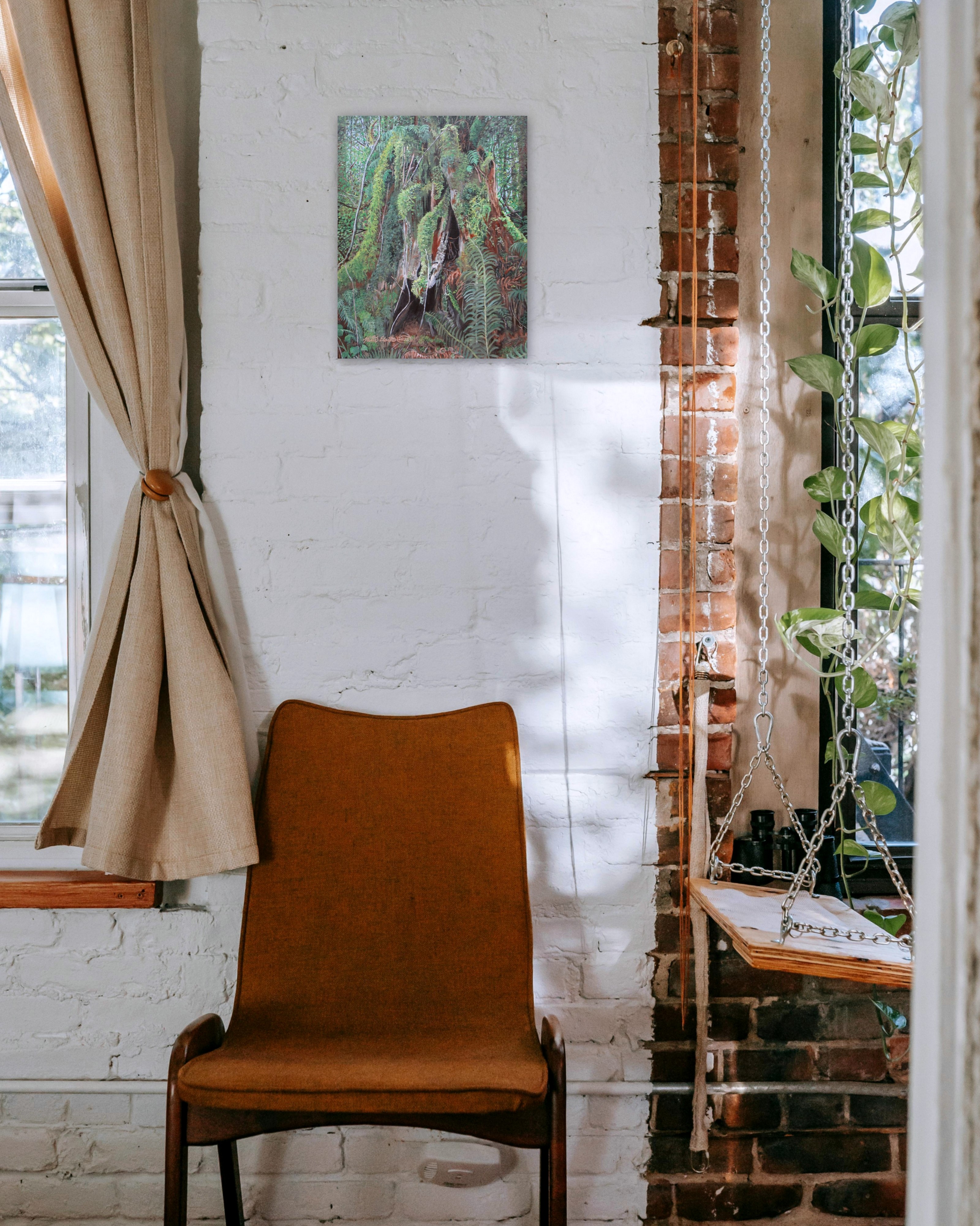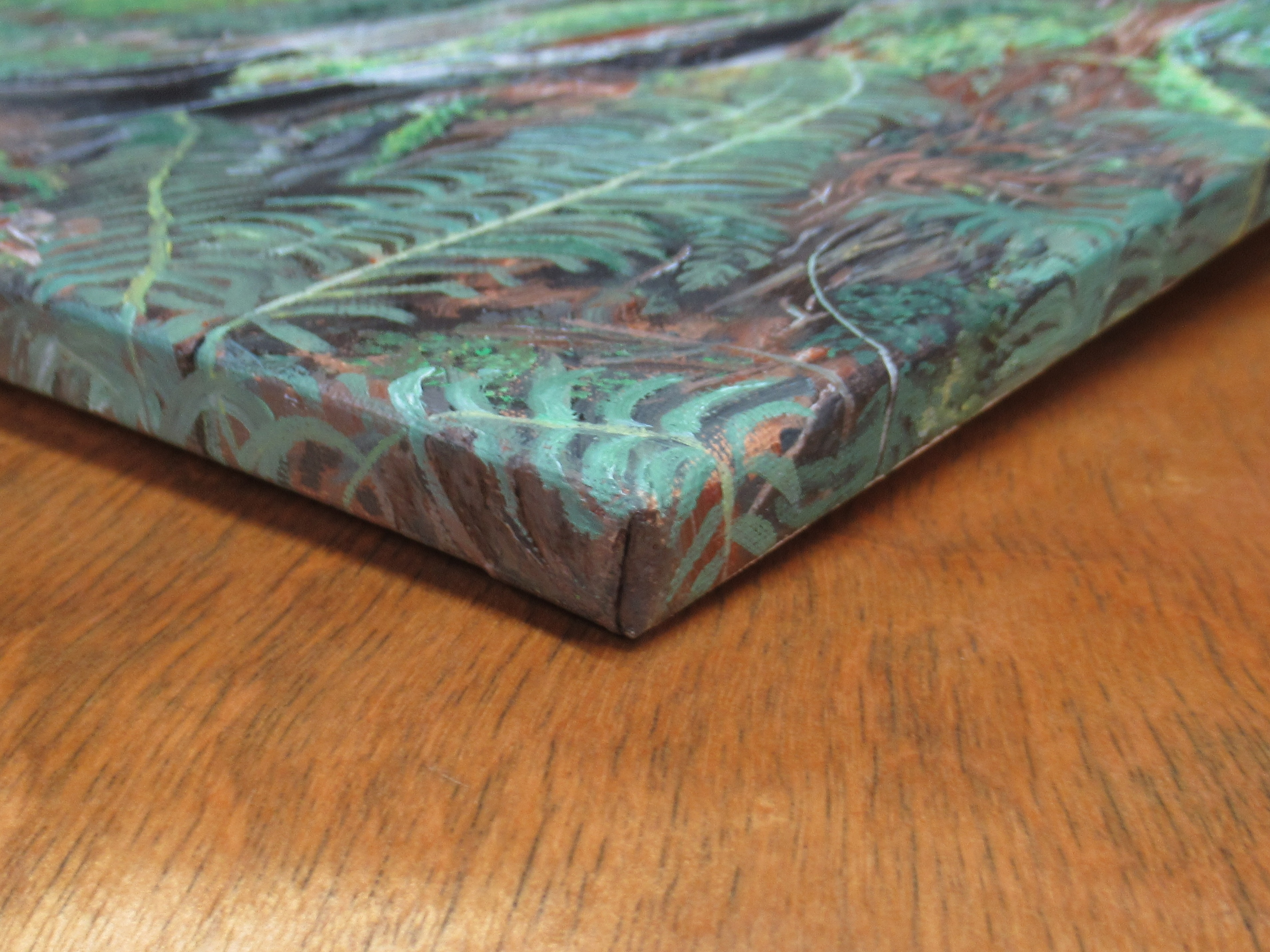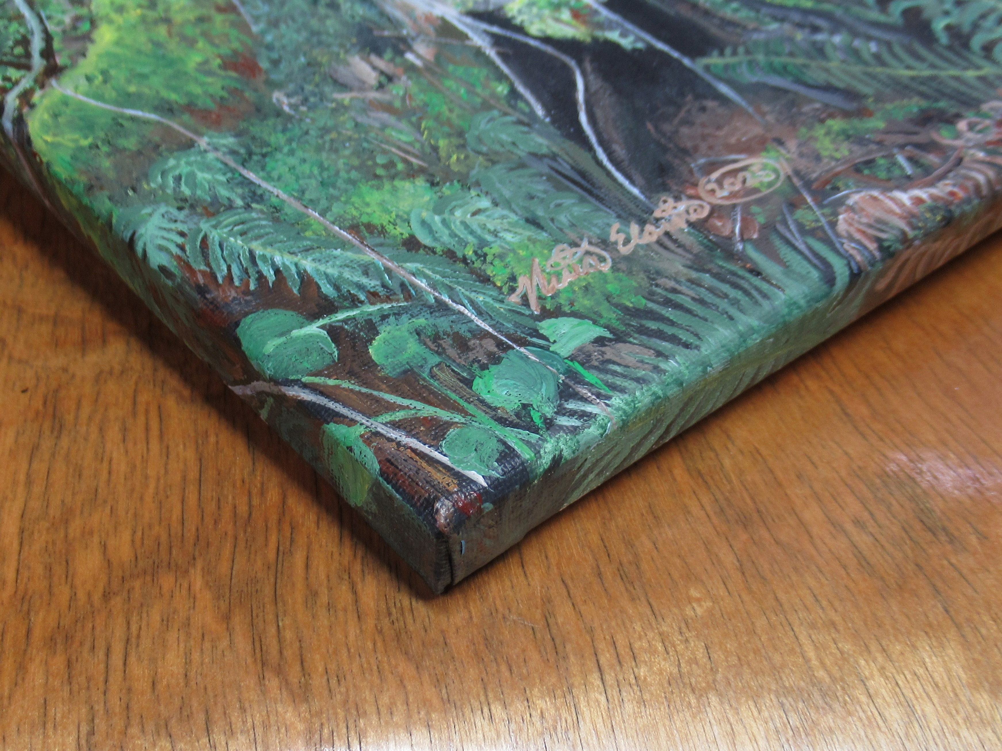 This painting, titled "Hollowed Tree Stump," was inspired by a hike through the forest on the way to the river. The artwork features a hollowed-out tree stump covered in moss. It looks like a cozy and inviting, rent-free shelter for creepy crawlies and small critters to inhabit. This is an acrylic painting on stretched canvas, size 11×14 inches with a 0.5 inch depth. This original, handmade artwork is signed by the artist, N.E.Thompson and comes ready to hang. Includes a signed certificate of authenticity.