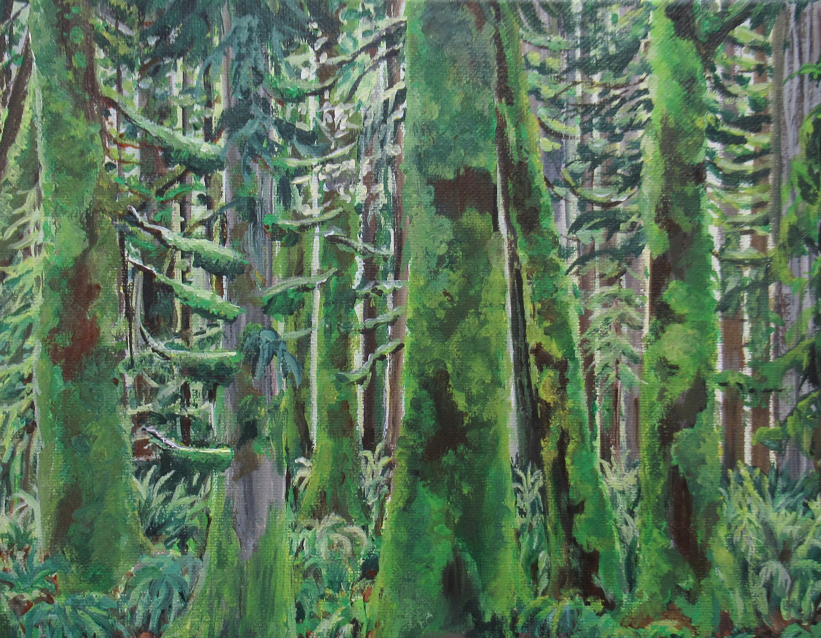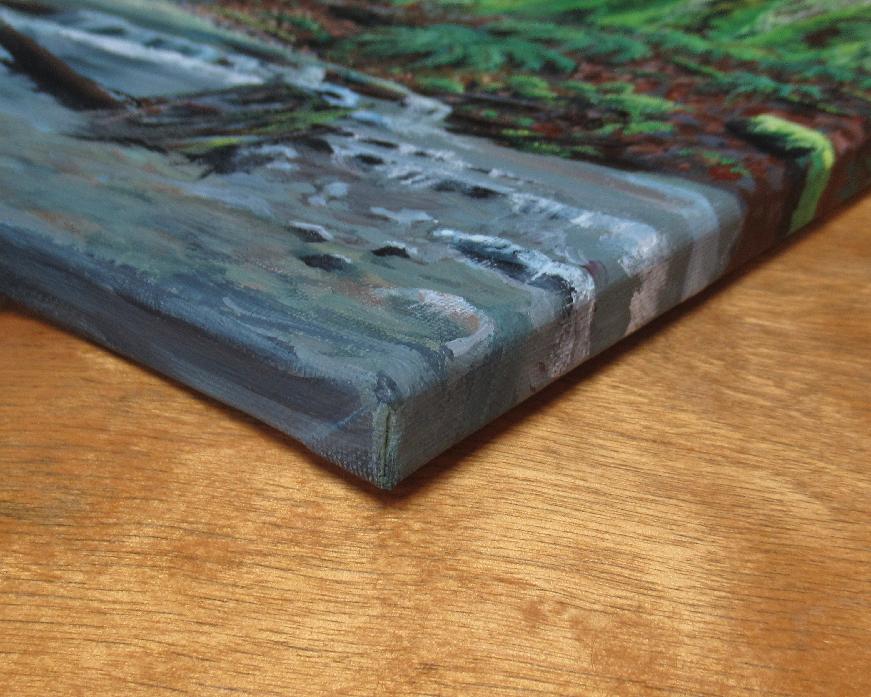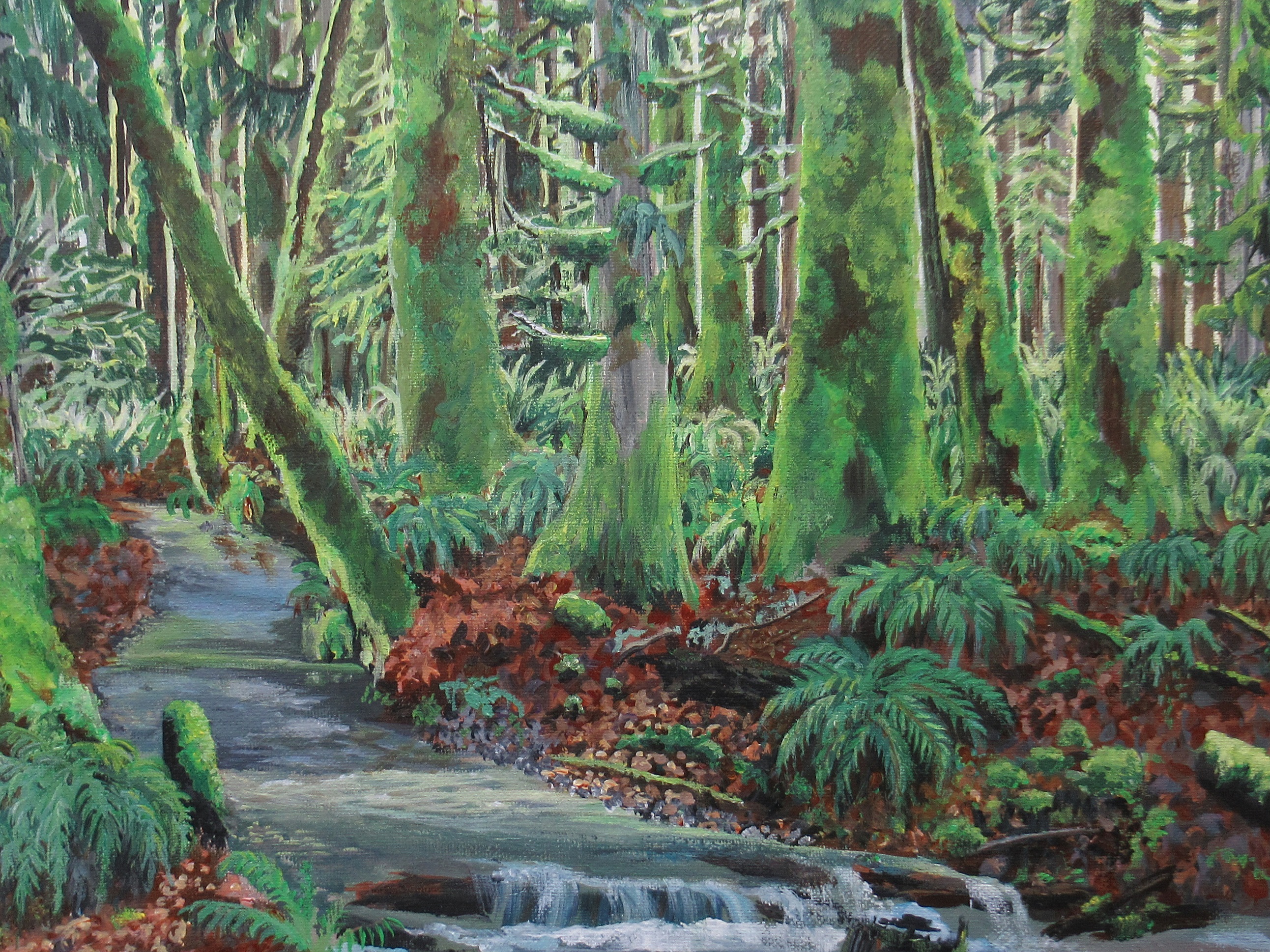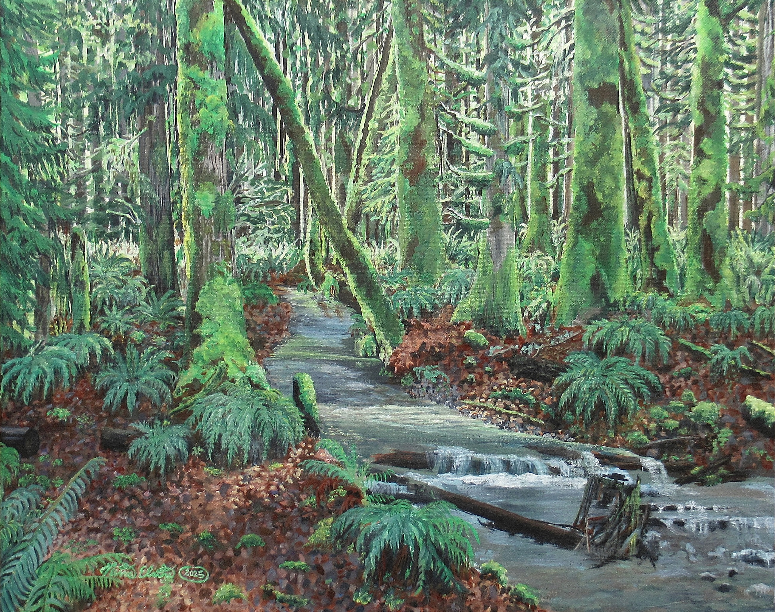 Acrylic painting on stretched canvas, size 16x20 inches, with a 0.5 ( half inch ) depth. This artwork, inspired by the the lush forests of the pacific northwest, depicts a creek carving it's way through the forest floor.