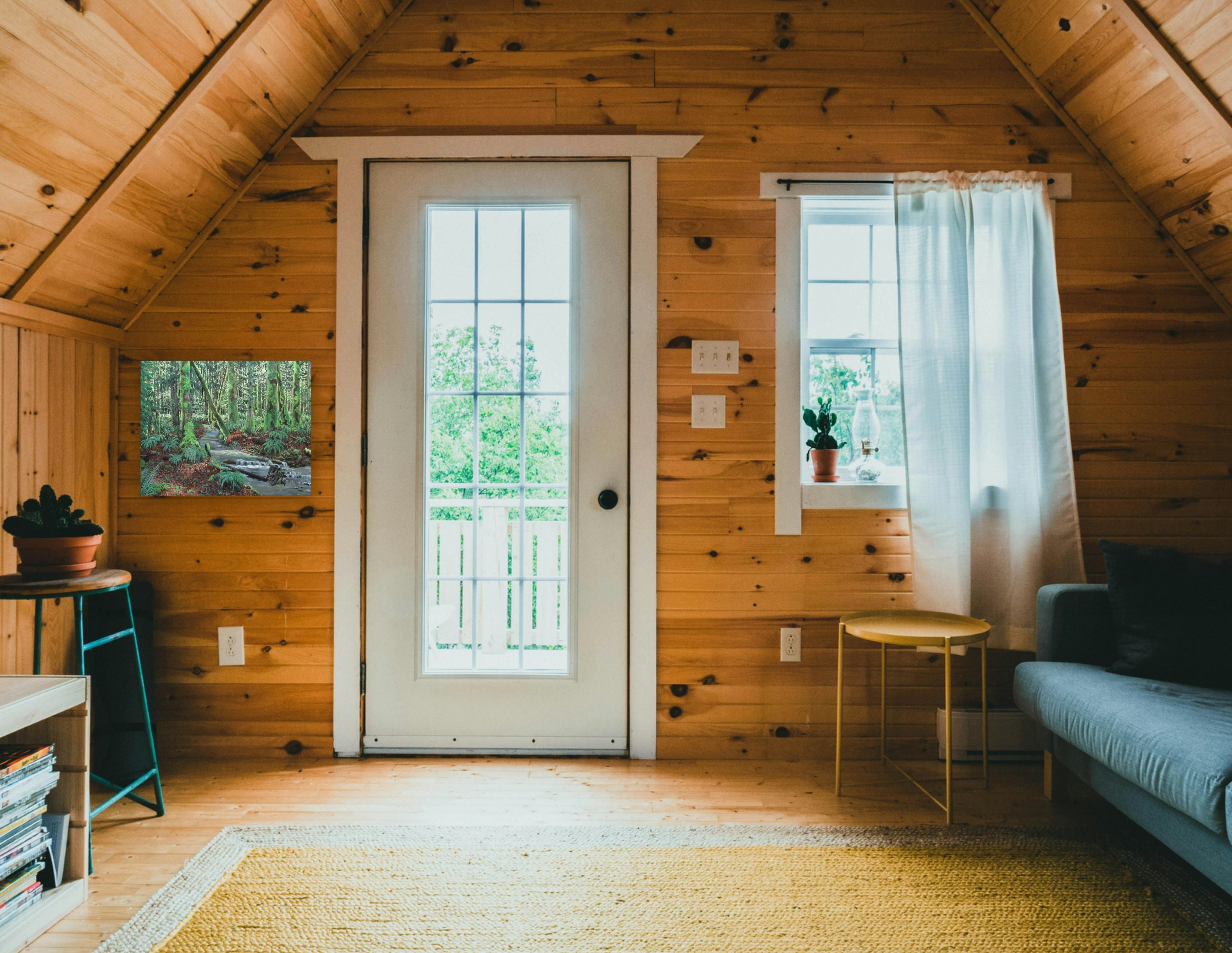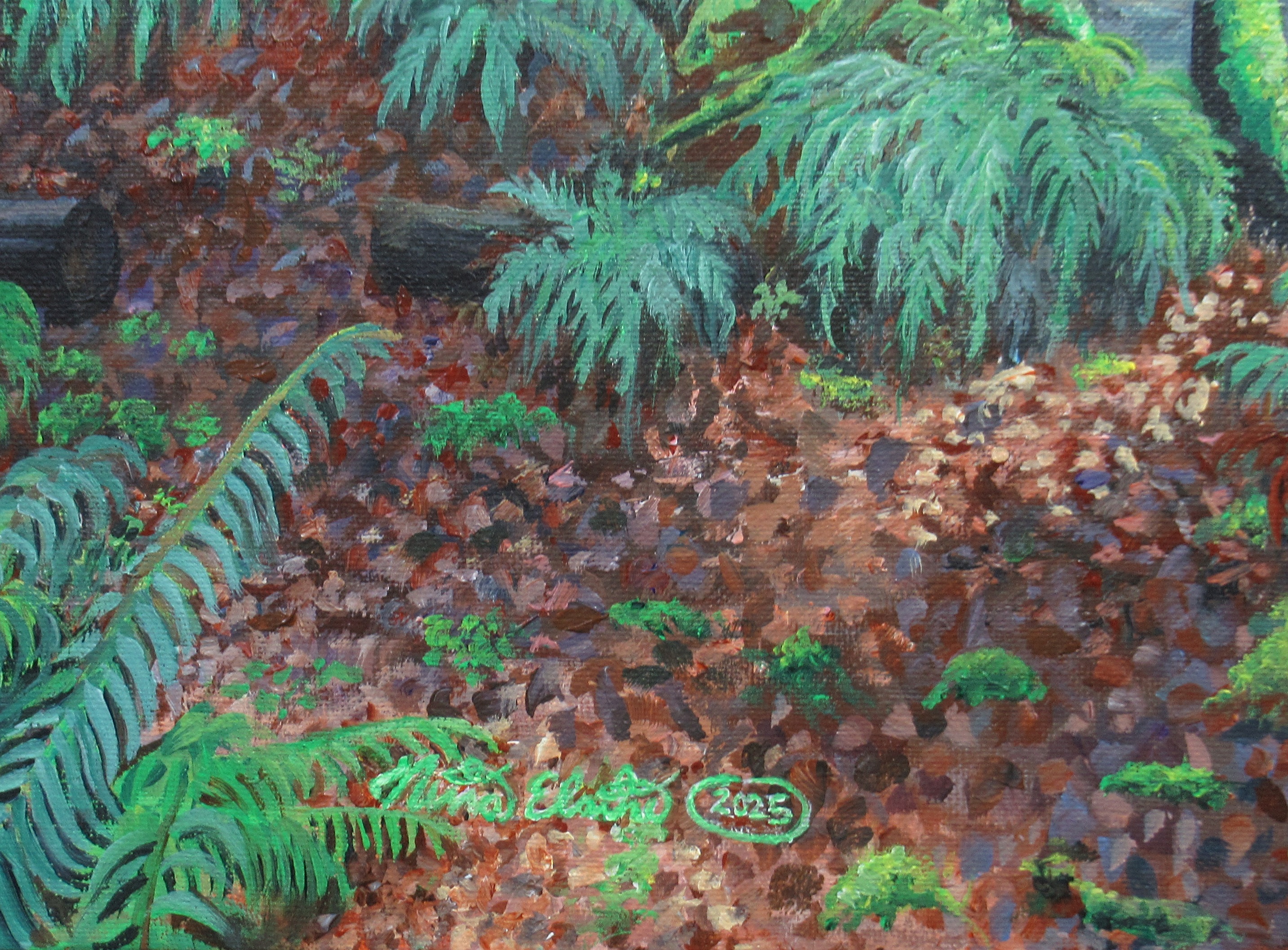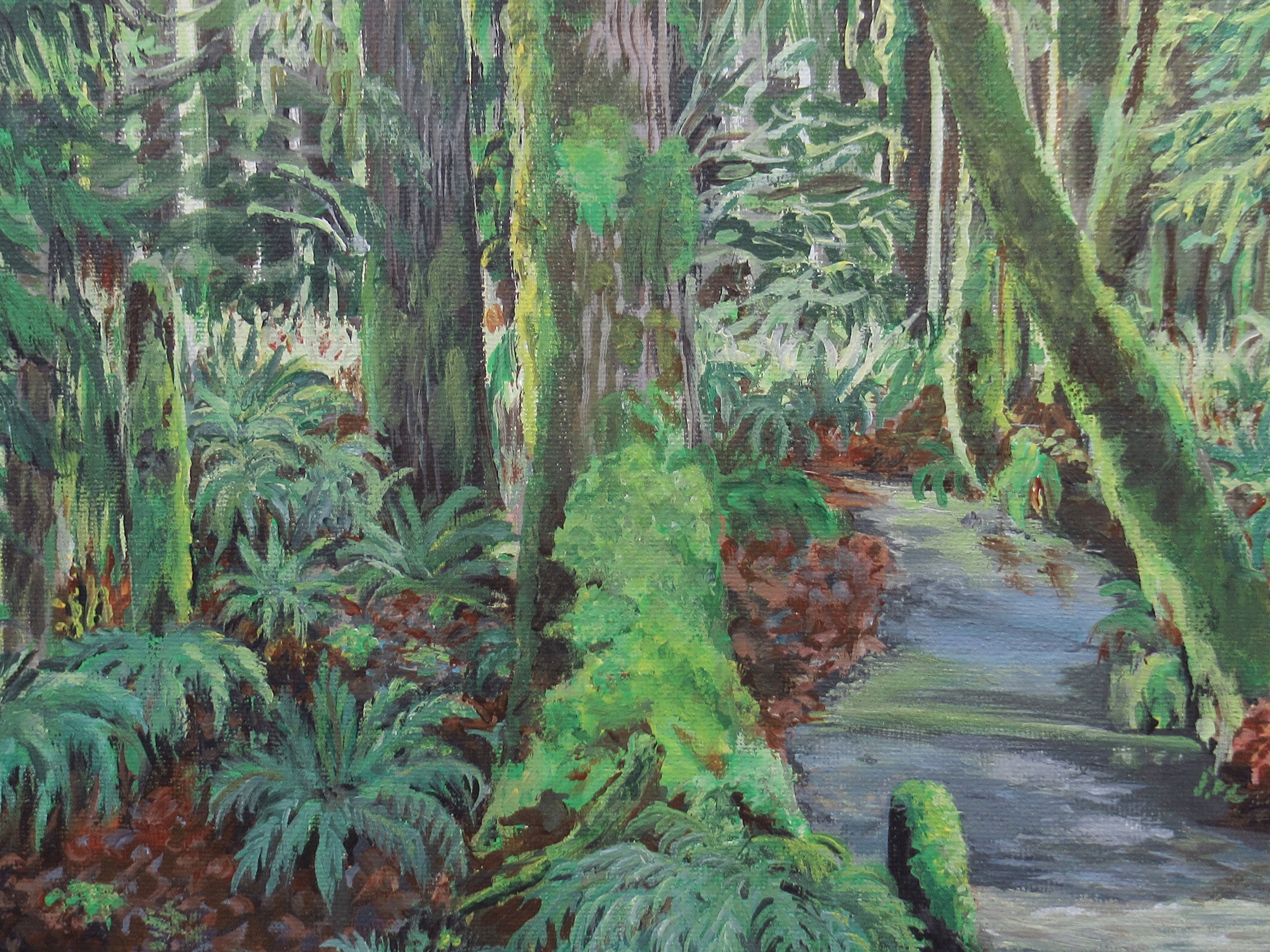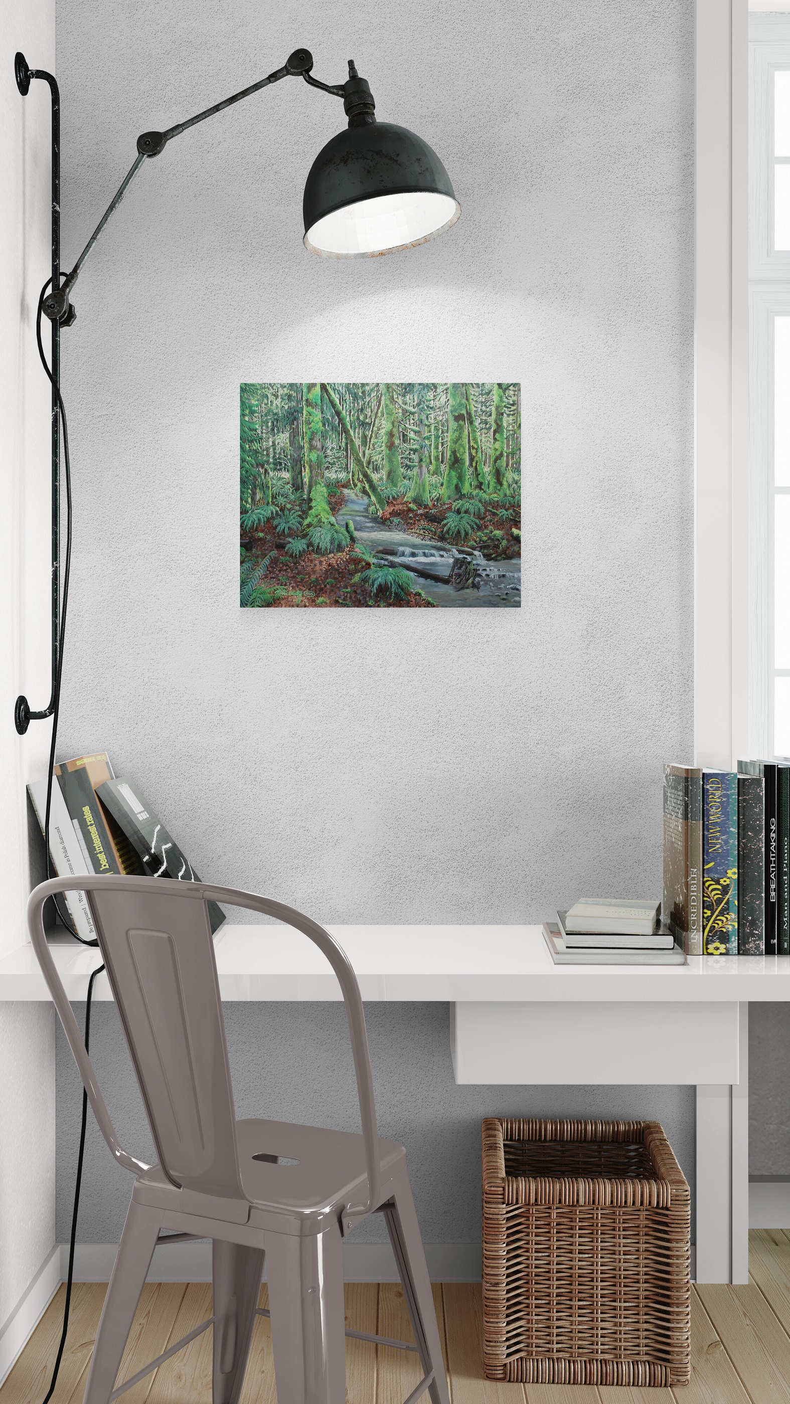 Acrylic painting on stretched canvas, size 16x20 inches, with a 0.5 ( half inch ) depth. This artwork, inspired by the the lush forests of the pacific northwest, depicts a creek carving it's way through the forest floor.