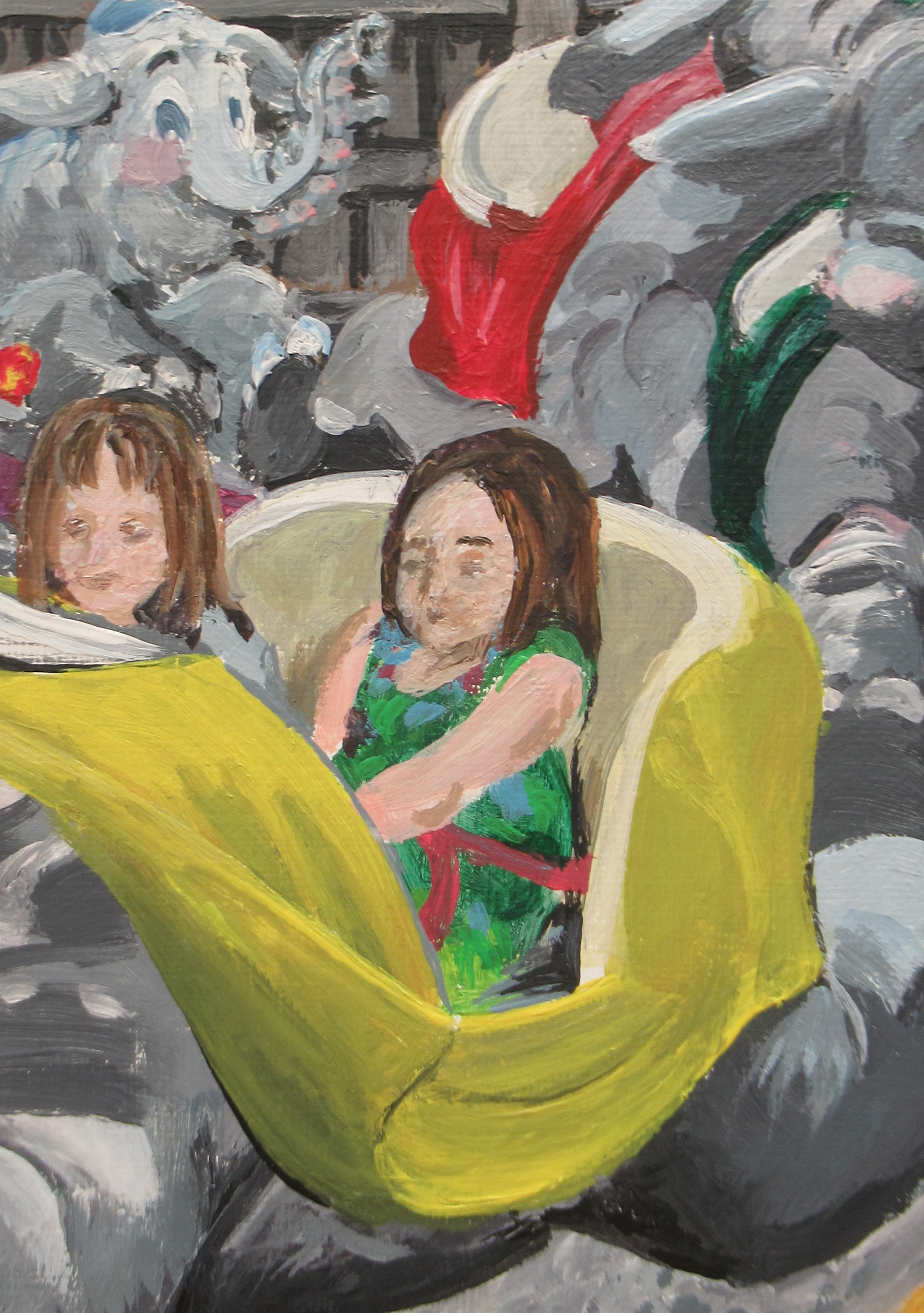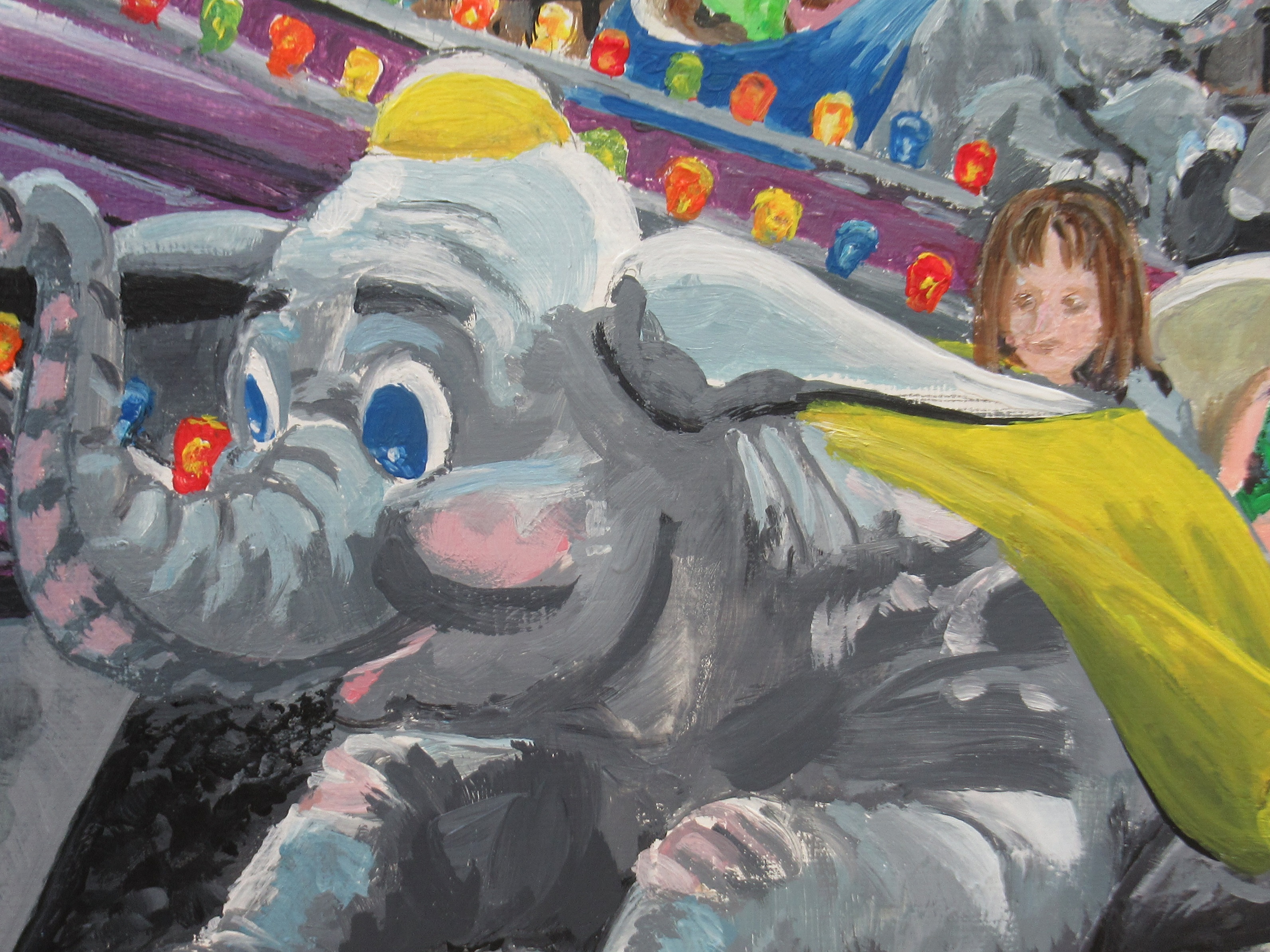 This painting, titled "Flying Elephants," invites you to explore the feeling of flight. Humans have a long history of trying to find ways to replicate the feeling of soaring through the sky like a bird. This adventure may begin for us as children, the first time we board a flying elephant.