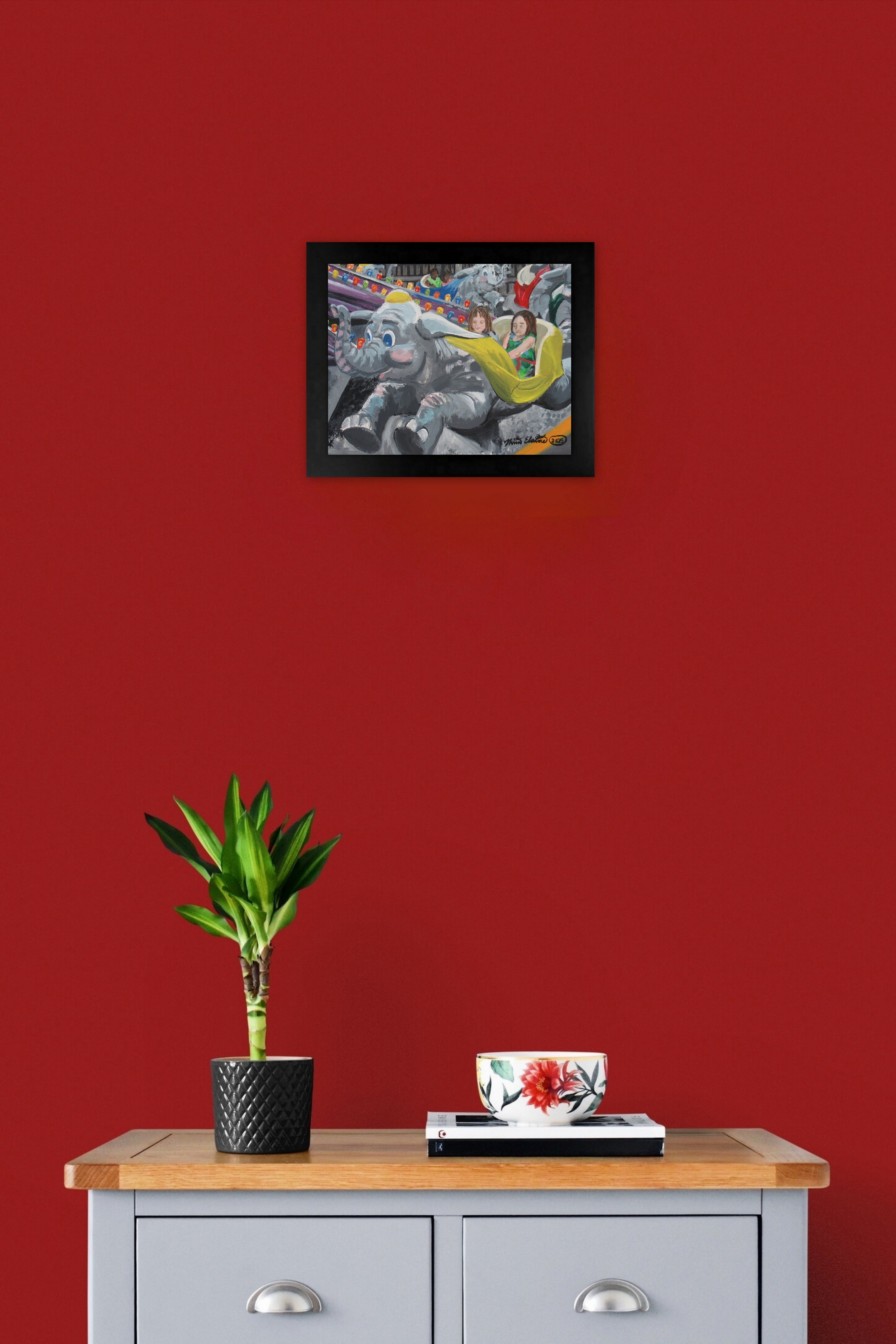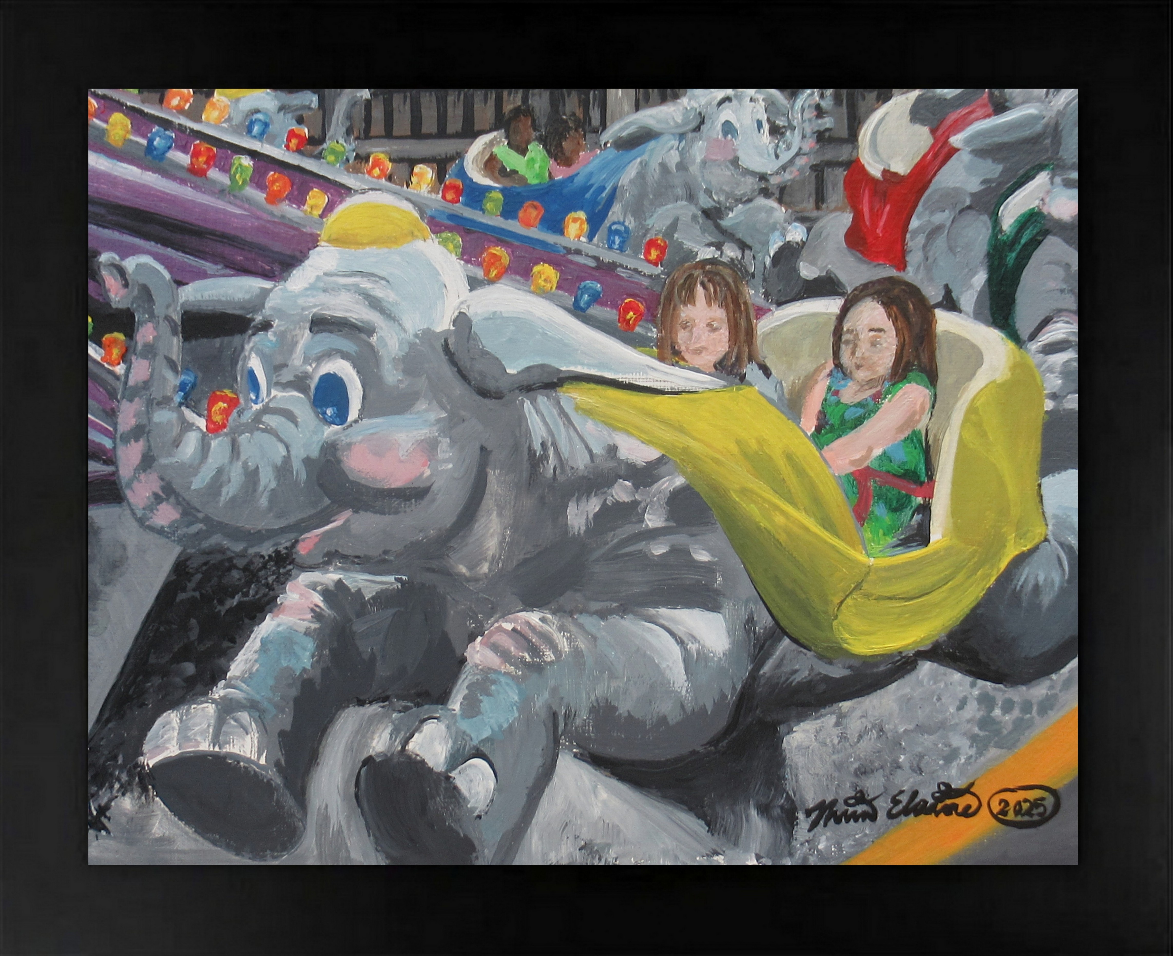 "Flying Elephants" Carnival ride painting by N.E.Thompson, Framed original artwork, size 8x10 inch canvas panel
