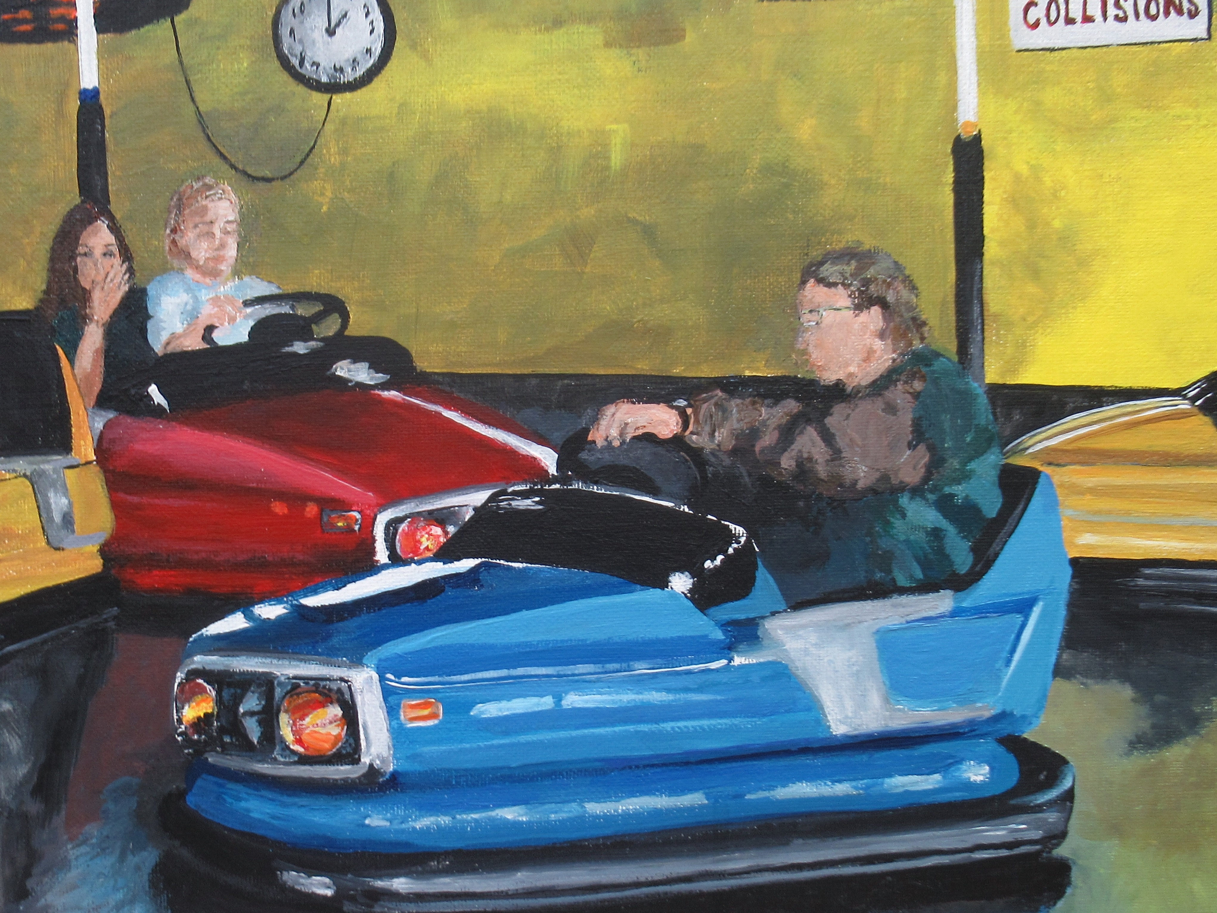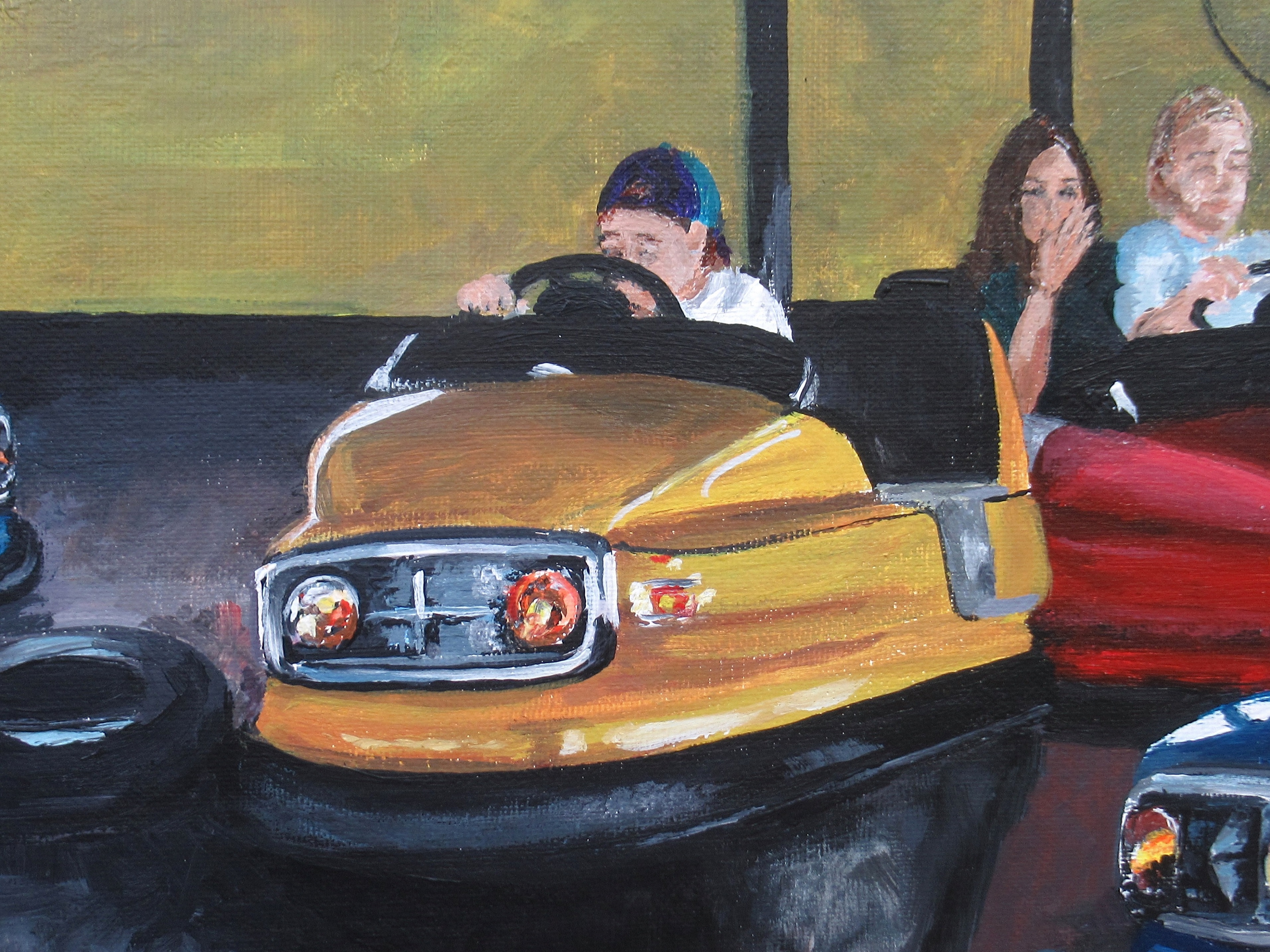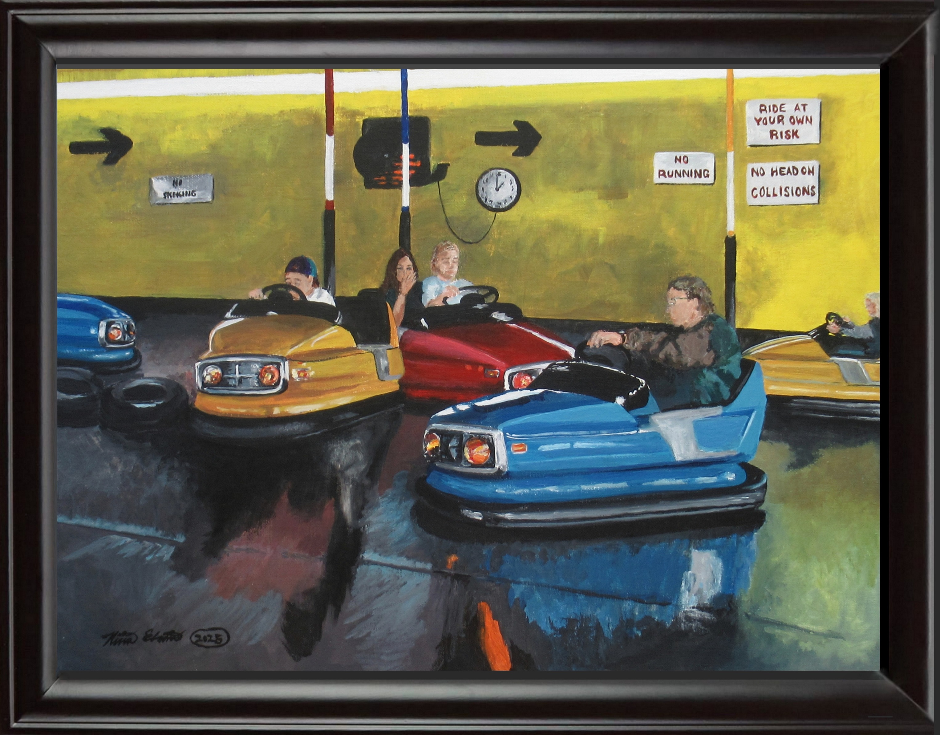This one-of-a-kind painting, "Bumper Cars," features an all-time classic carnival ride. Imagine being of the understanding that the objective of driving is not to hit anything. Then one day you discover a marvelous ride where you are encouraged to bump your neighbor's car. What fun you'll all have!