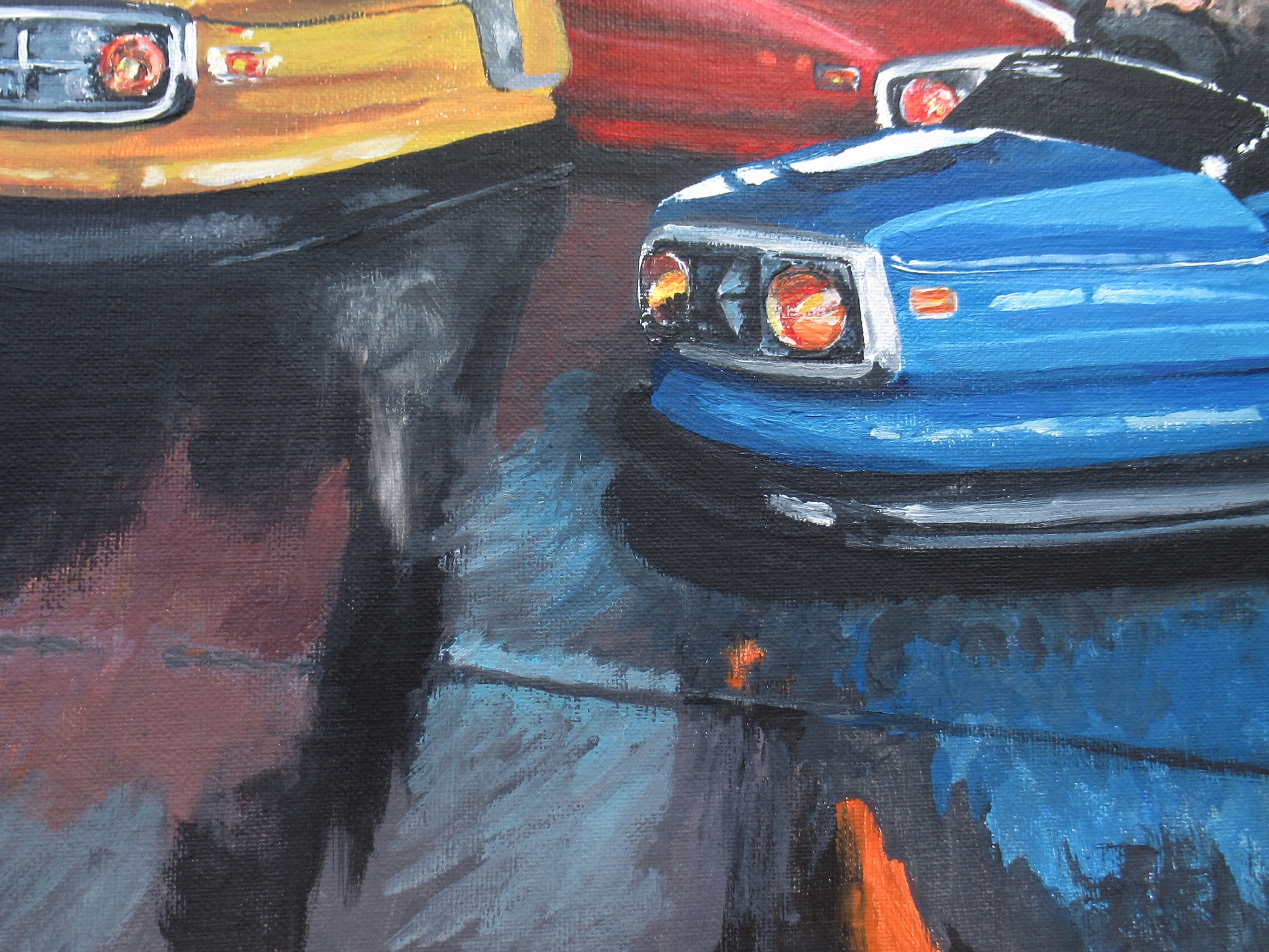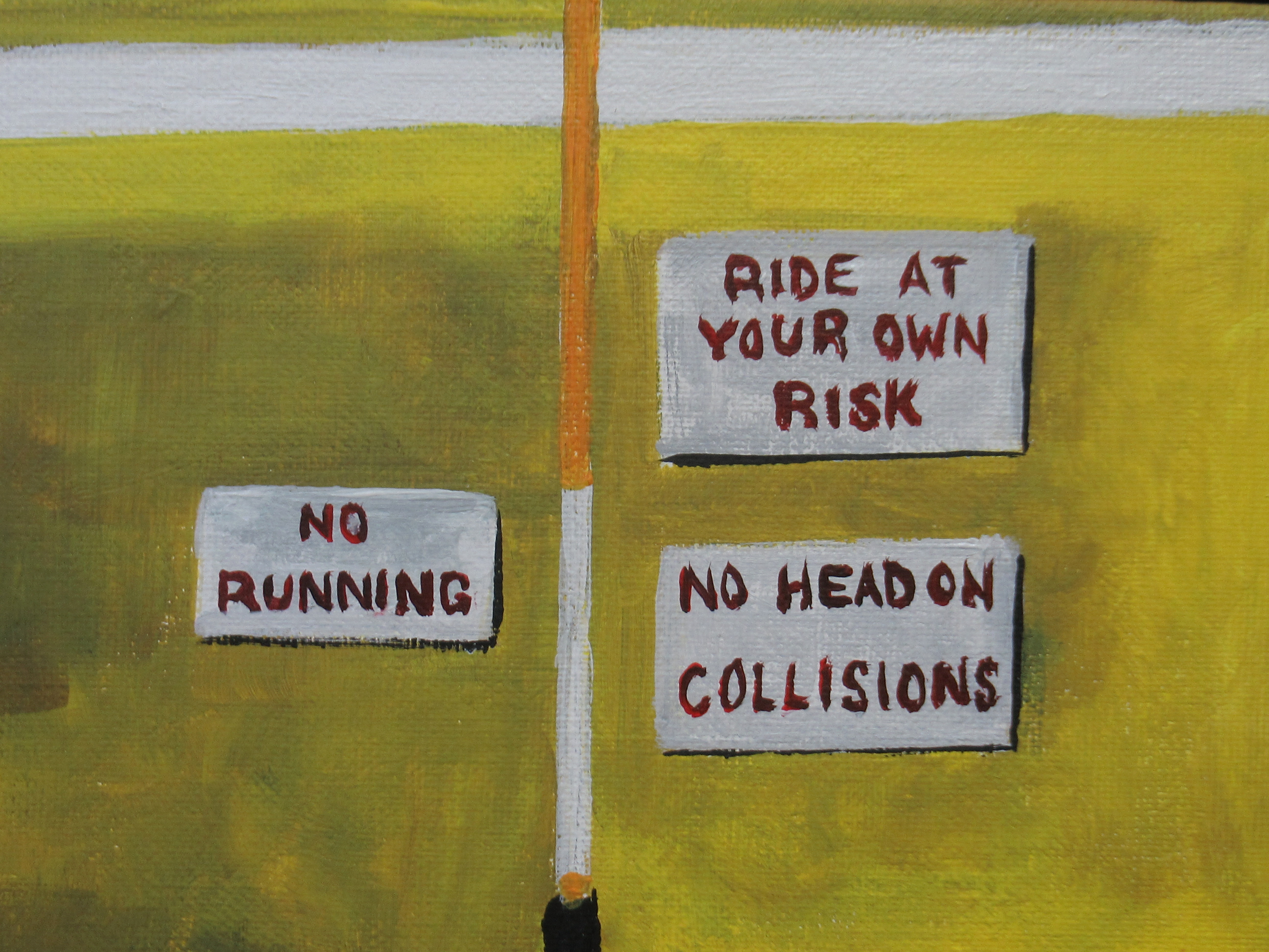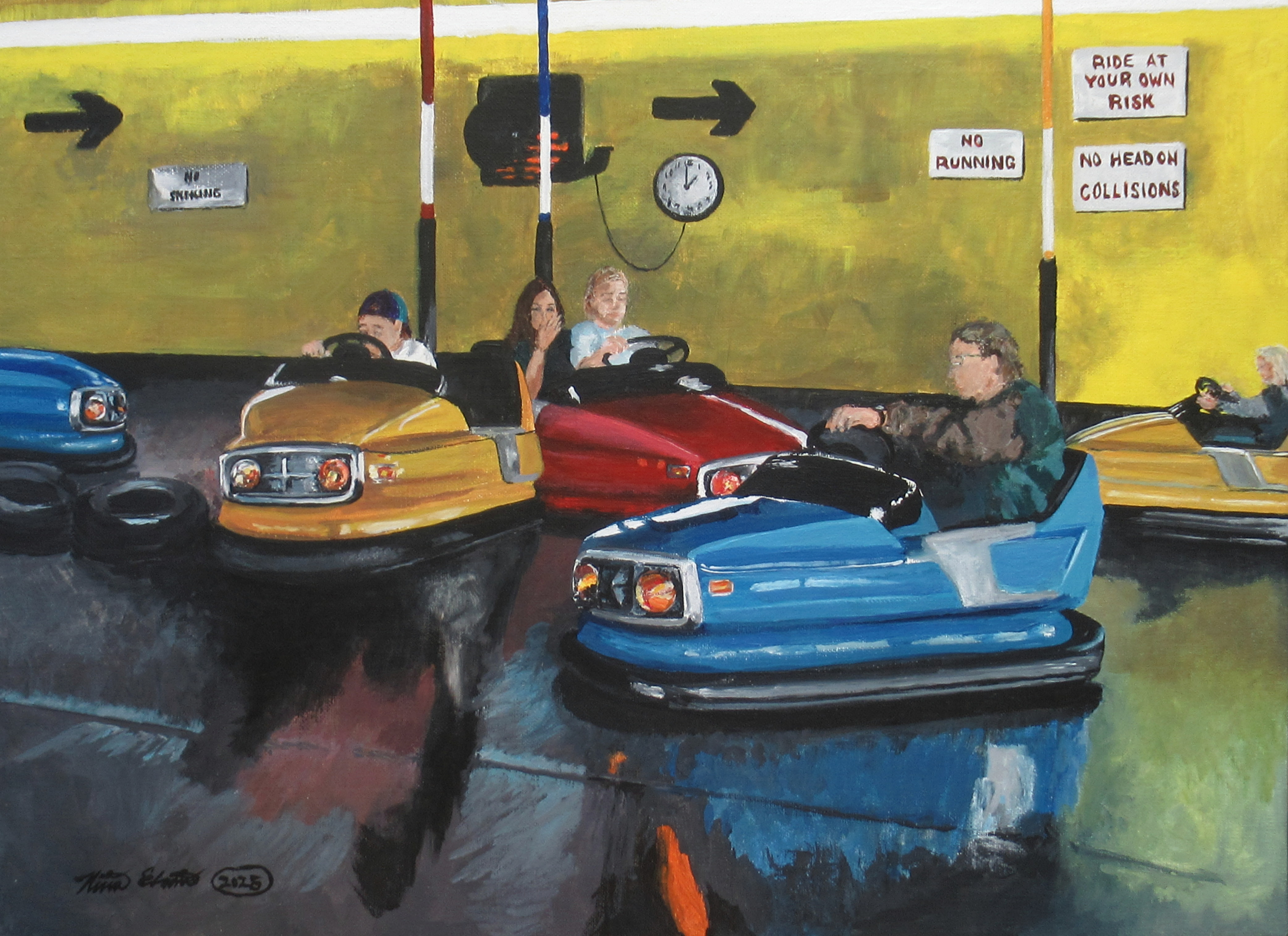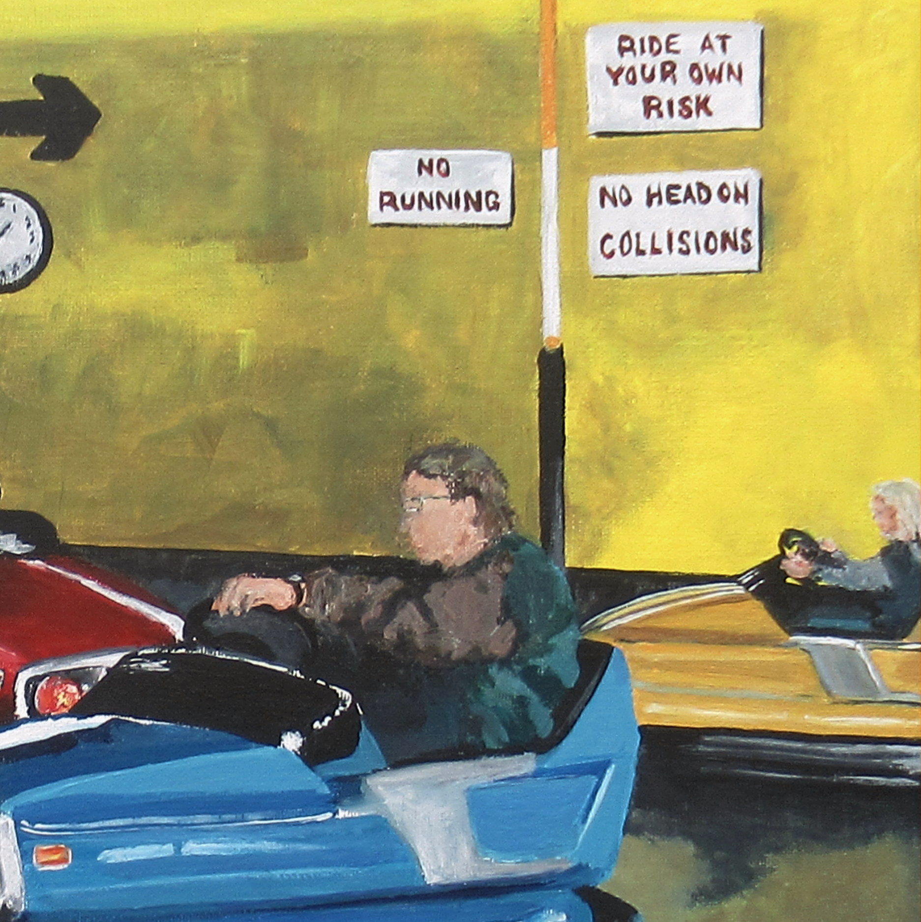 This one-of-a-kind painting, "Bumper Cars," features an all-time classic carnival ride. Imagine being of the understanding that the objective of driving is not to hit anything. Then one day you discover a marvelous ride where you are encouraged to bump your neighbor's car. What fun you'll all have!