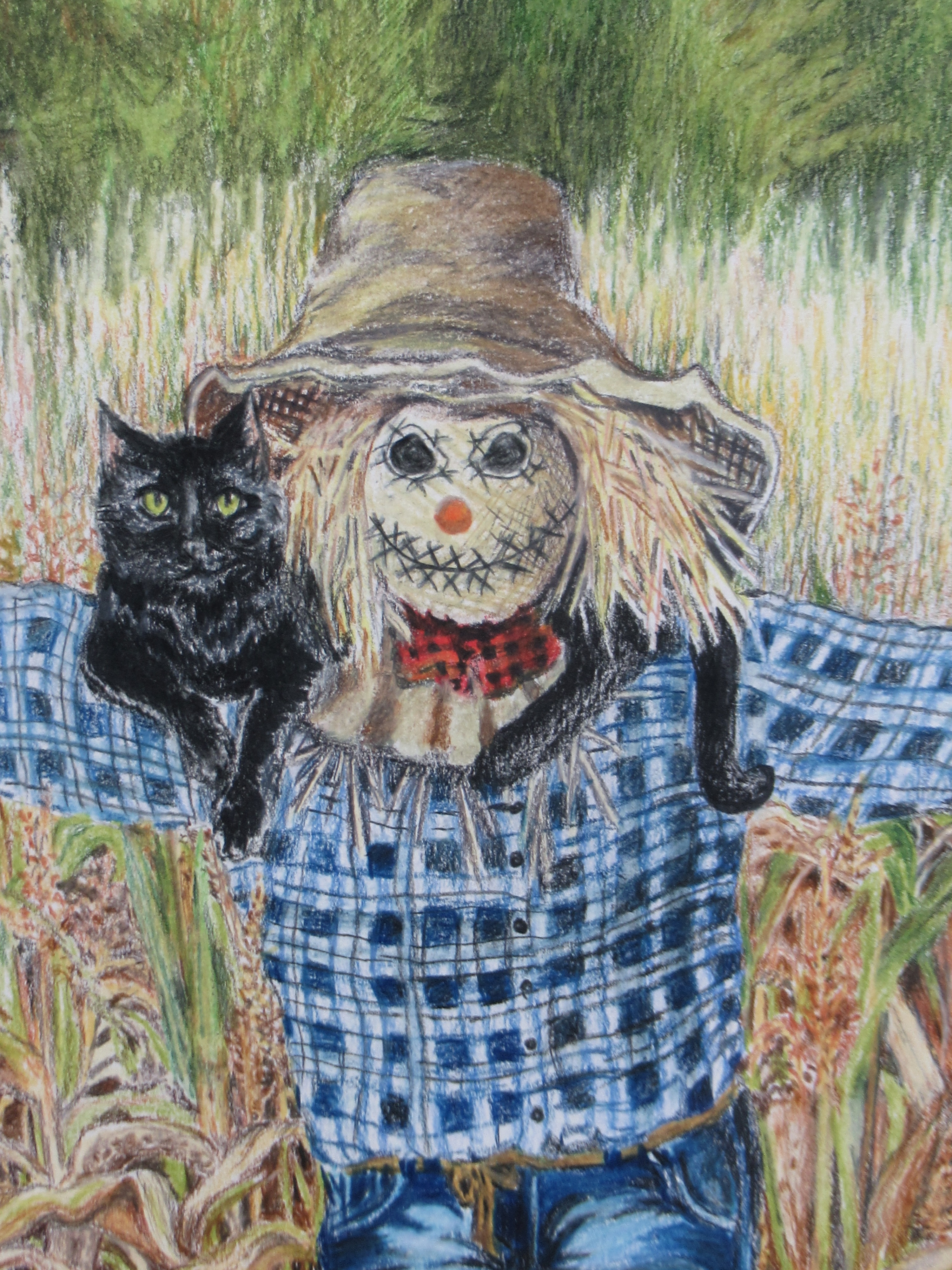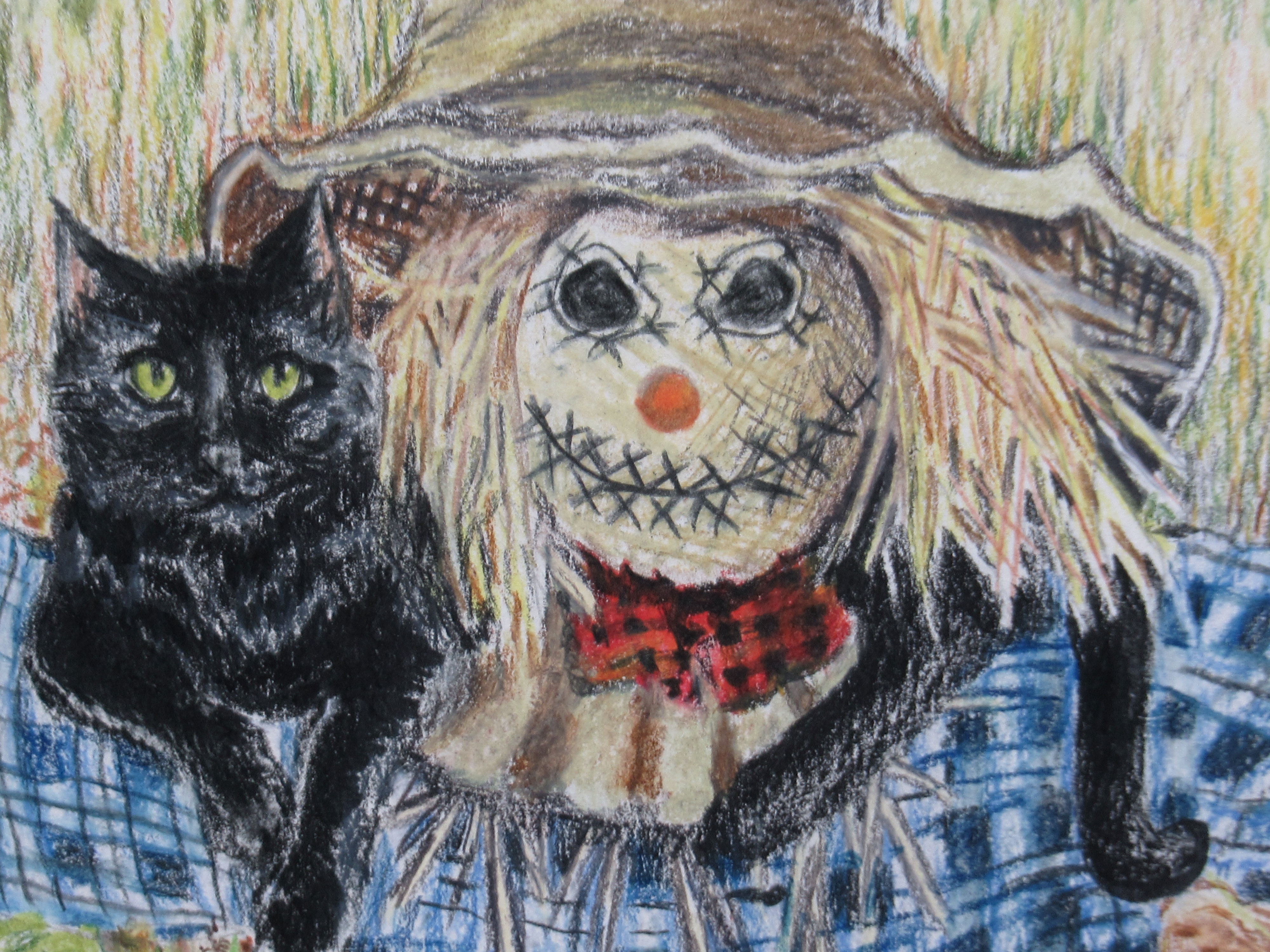 Scarecrow And Scaredy Cat, Original colored pencil artwork, By N.E.Thompson, size 11x17 inches