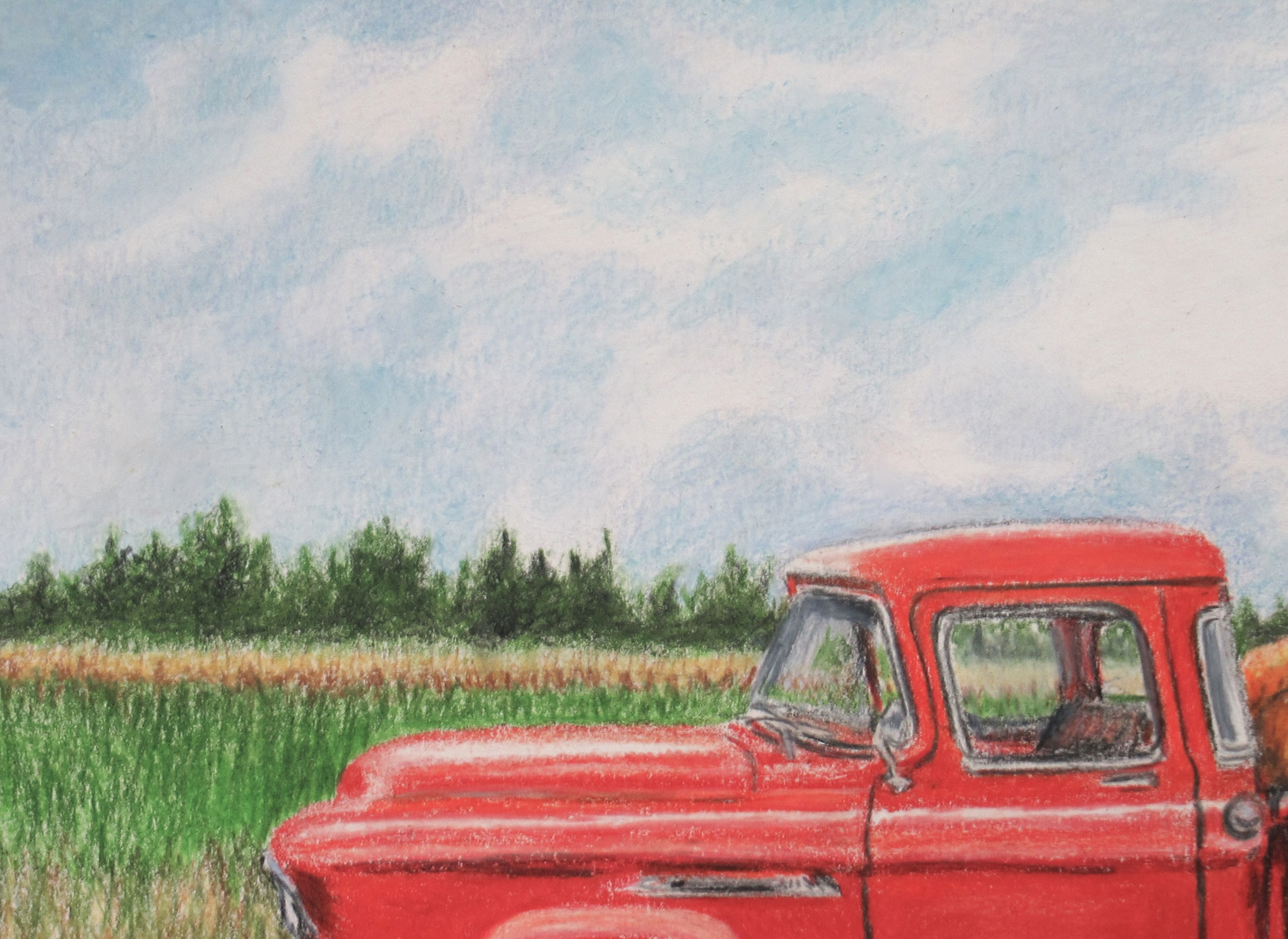 This piece was created for fall and is inspired by the farms that use old farm trucks as their pumpkin display. It blends a love of autumn with a passion for classic American automobiles.