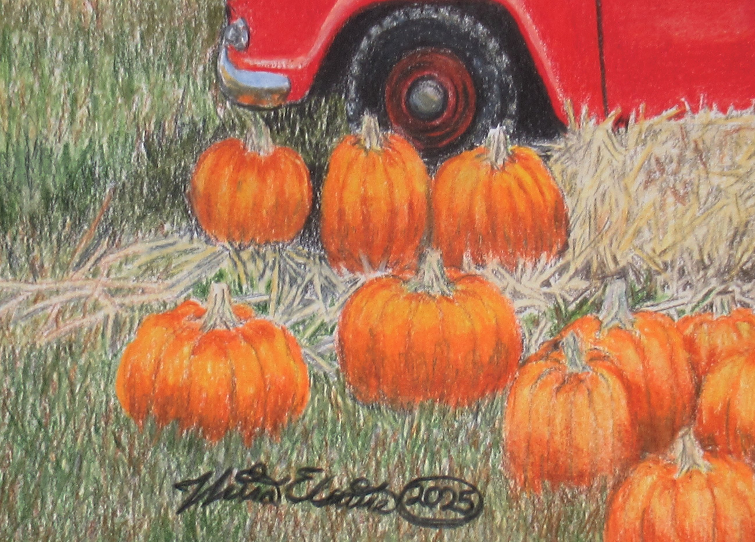 Truck Load Of Pumpkins, Original colored pencil artwork, By N.E.Thompson size 9x12 inches